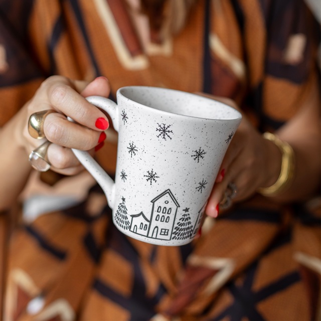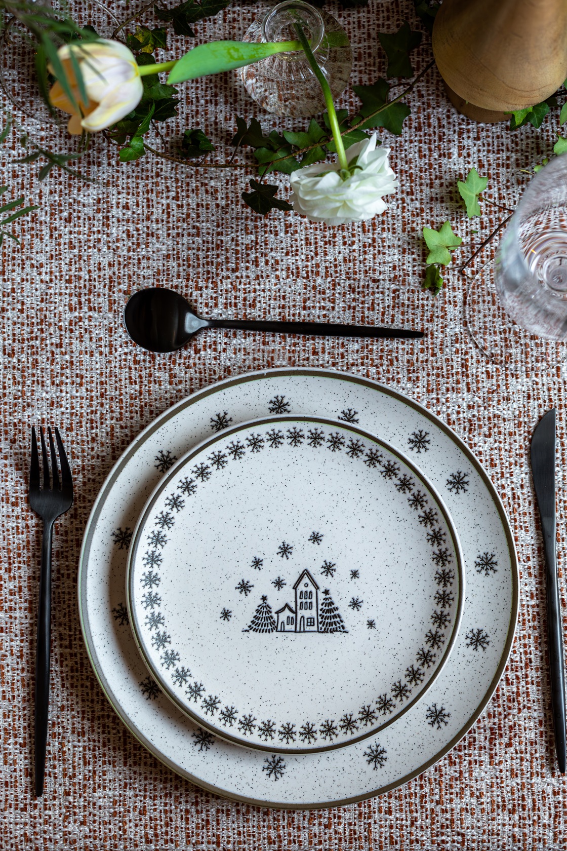 Já a coleção Vilarejo de Natal aposta em uma atmosfera acolhedora e nostálgica. Suas ilustrações remetem às tradicionais paisagens de inverno, pequenas vilas iluminadas e cenas que evocam memórias familiares. Com traços delicados, a linha cria um cenário poético e caloroso, perfeito para quem valoriza rituais mais clássicos e deseja imprimir à mesa um toque de tradição e serenidade. É como trazer um cartão de Natal ilustrado para o centro da celebração.