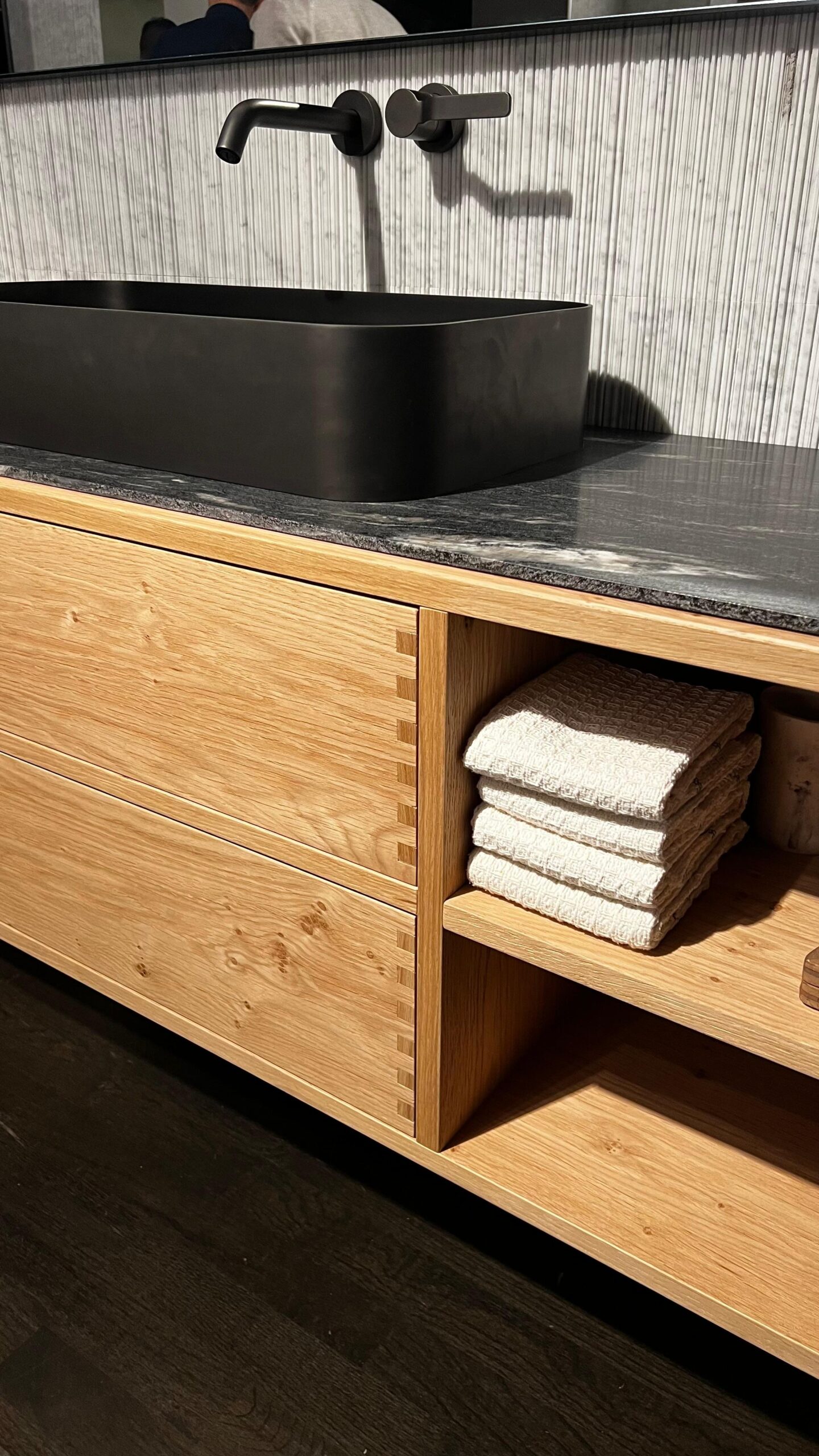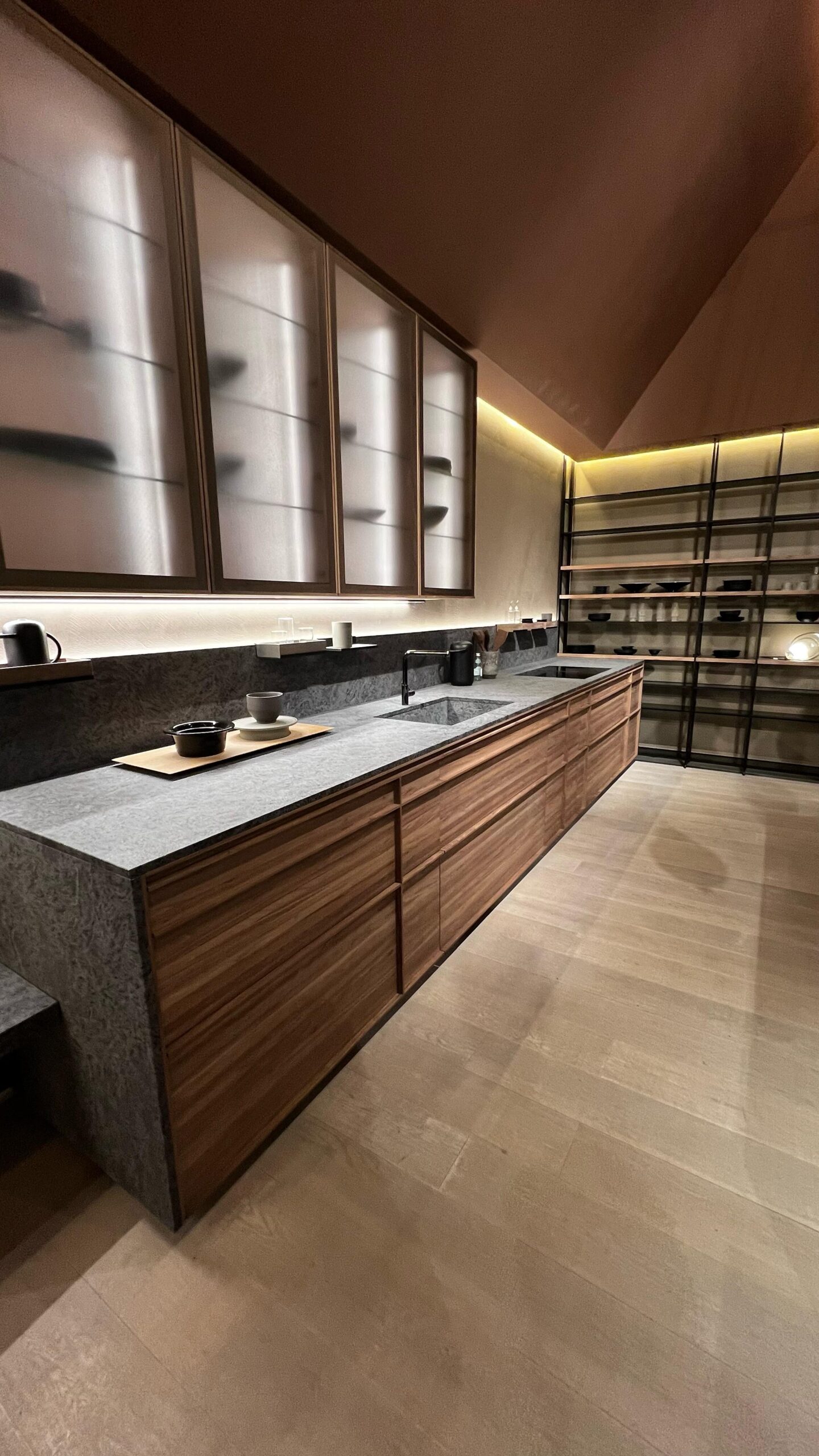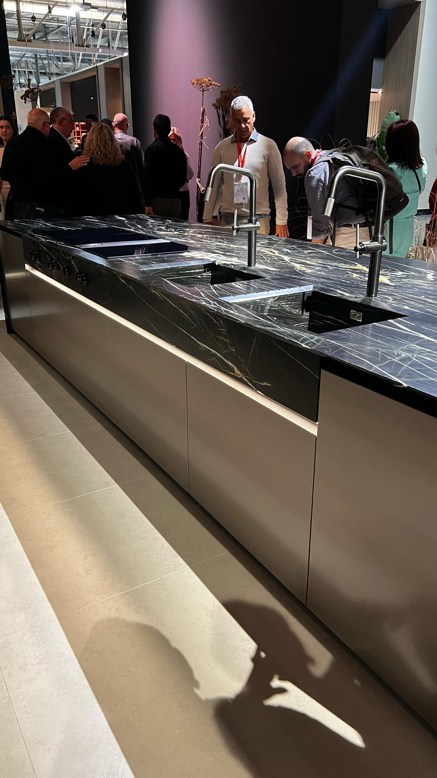 Acabamentos escuros e fechados predominaram, mas sempre equilibrados. A tecnologia nos eletros também chamou atenção, forno auto-limpante que parece uma lava louças, incrível! Adegas com abertura por toque e refrigerador com adega são alguns dos muitos destaques, os eletros também não ficaram para trás nas inovações.