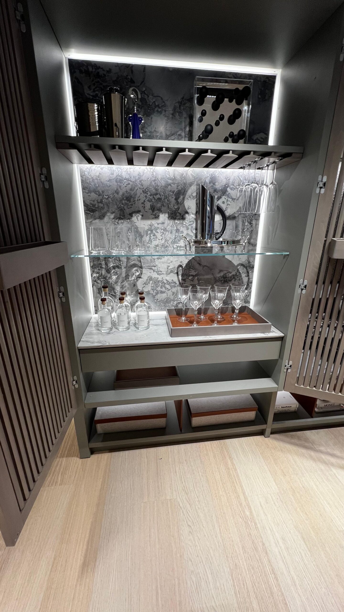 Vidros, pedras, tons de azul, verde e em alta, greige predominaram, assim como o uso e abuso de led em todas as peças, a iluminação nos corpos dos móveis em direção aos puxadores foi meu destaque favorito.