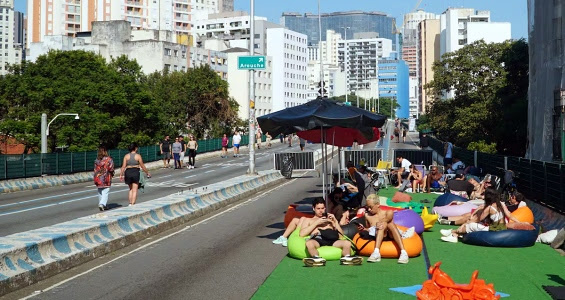 Mas a cidade muda — e o Minhocão também. Aos fins de semana, quando o tráfego dá lugar às pessoas, o elevado revela uma nova vocação. Cerca de 40 mil paulistanos ocupam o espaço para correr, pedalar, praticar ioga, jogar xadrez gigante ou simplesmente contemplar a cidade de outro ponto de vista. Com mobiliário urbano temporário, pufes, guarda-sóis e intervenções artísticas, o concreto ganha vida e se transforma em um parque suspenso informal, muitas vezes descrito como uma “praia urbana” no centro da capital.