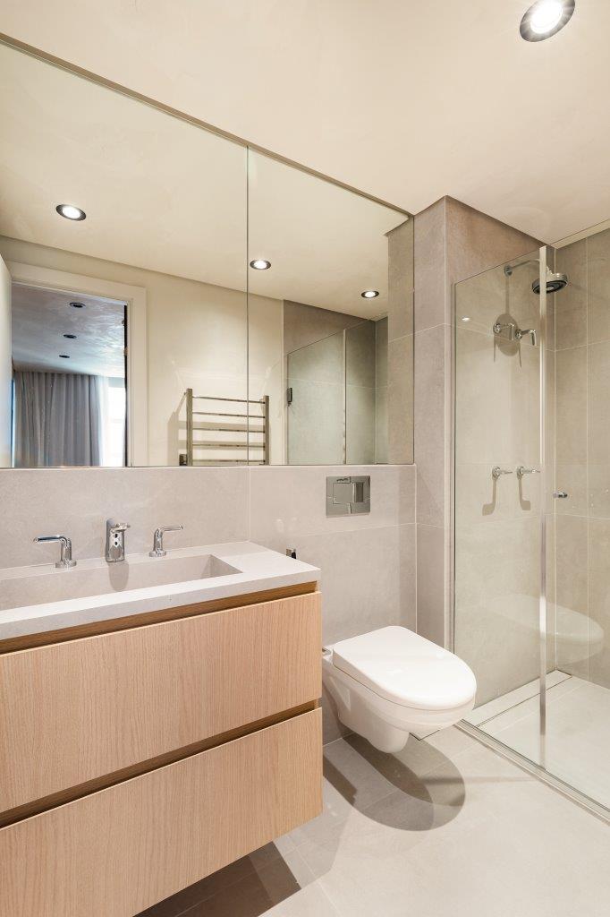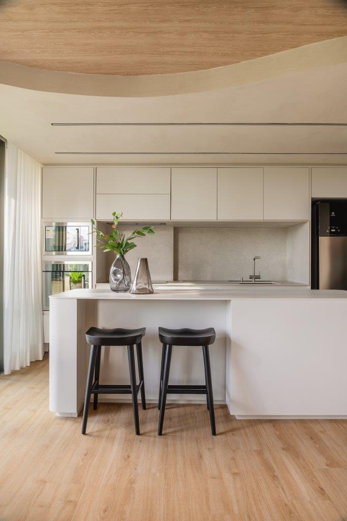 A entrada recebeu soluções funcionais, como armário para objetos de fácil acesso e pórtico iluminado com banco. No corredor, um espelho amplia a luz natural e reflete parte da vista das copas das árvores que emolduram a sala. O estar integrado é o ponto alto: forro de gesso elevado, sofá ilha com diferentes configurações e mesa de jantar orgânica dialogam com a cozinha em paleta neutra e texturas sofisticadas, incluindo pintura com efeito de nuvem e lâmina sinterizada que remete à pedra natural.