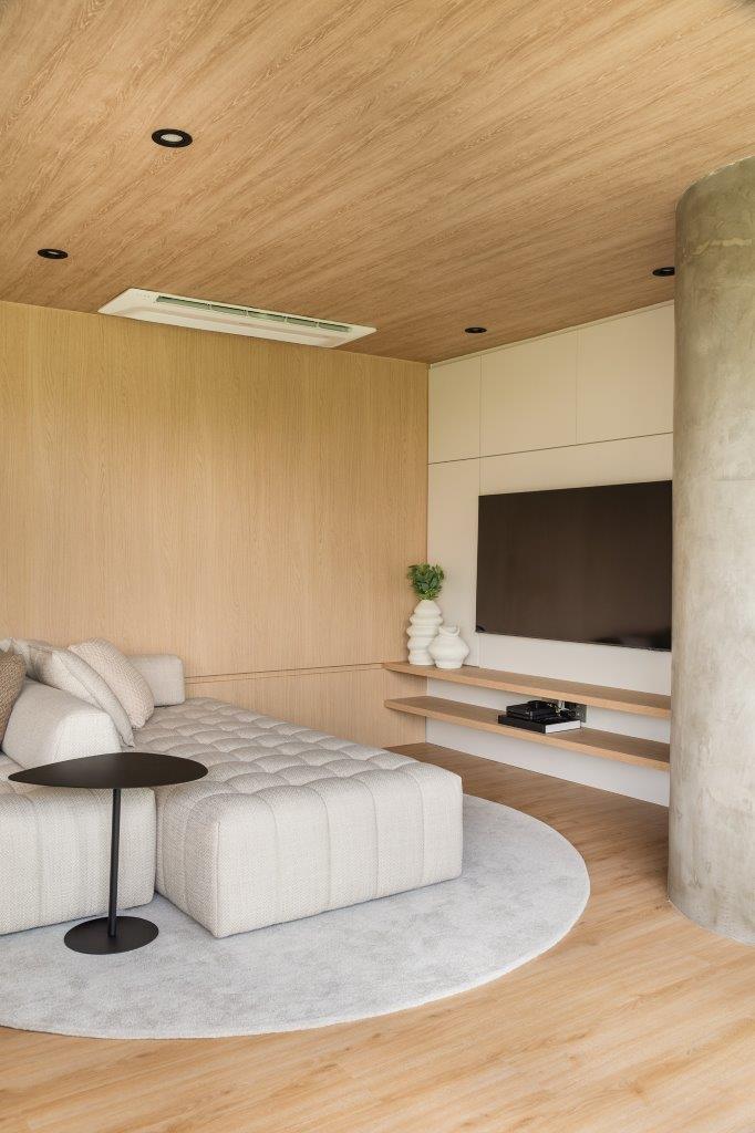 A iluminação indireta é um dos pontos fortes do projeto: no estar, o painel com led embutido garante clima intimista; nos quartos, fitas de led aplicadas na marcenaria oferecem suavidade e conforto. O piso vinílico com efeito de madeira e o adesivo no forro que imita o material natural foram escolhas estratégicas que aliam estética, durabilidade e controle de custos.