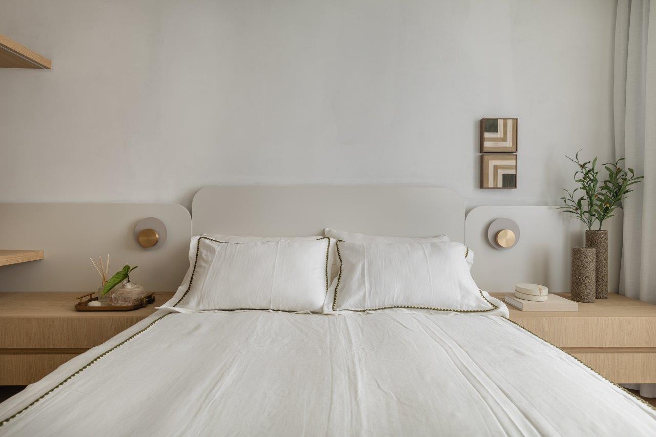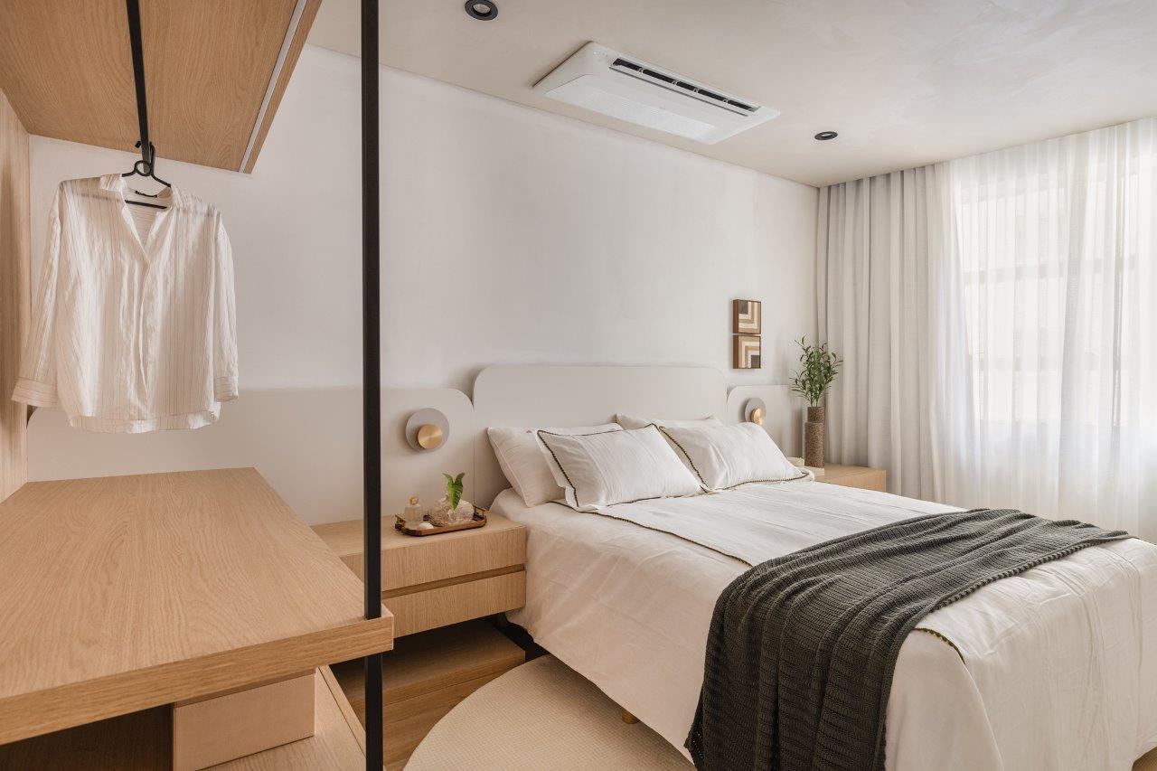 Nos dormitórios, a linguagem curva aparece novamente. A suíte de hóspedes recebeu cabeceira iluminada e soluções sob medida para otimizar o espaço compacto, enquanto a suíte principal ganhou um ambiente descomplicado, com armário aberto e iluminação abundante, perfeito para estadias mais curtas.