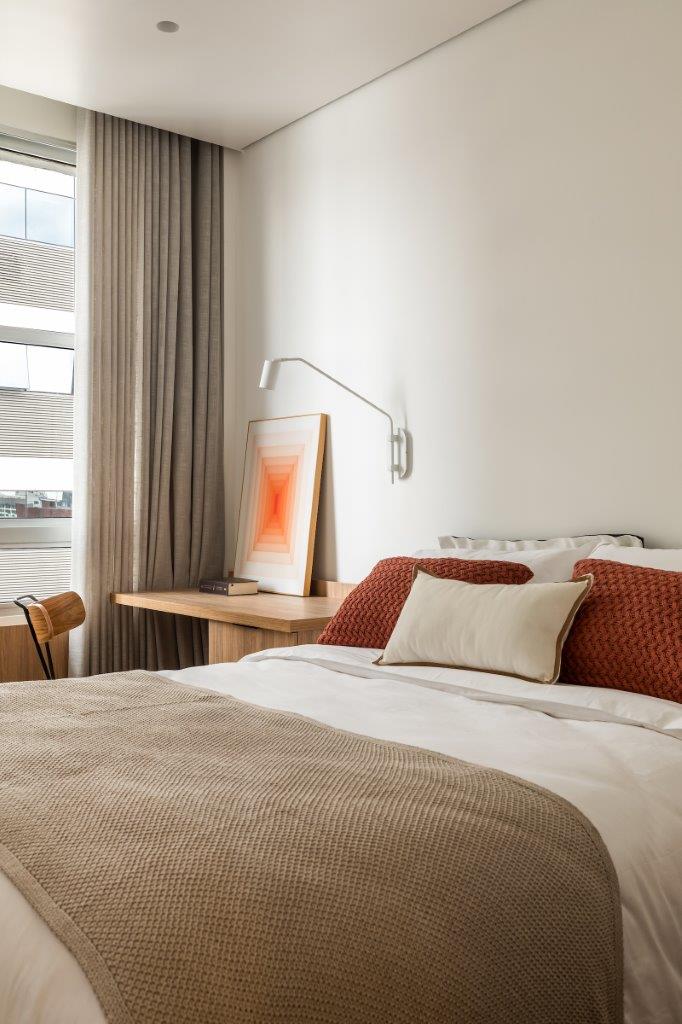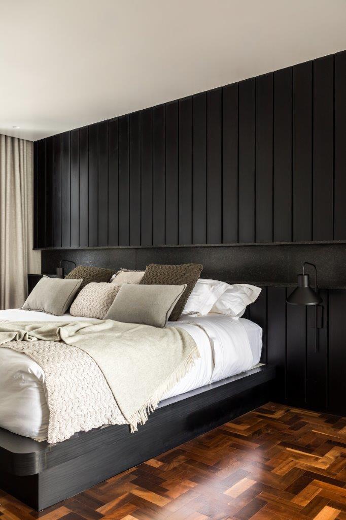 Na suíte master, a madeira em tonalidade preta e o piso de tacos escuros contrastam com as paredes e forro brancos, criando um ambiente aconchegante e sóbrio. Um dos três quartos originais do apartamento foi transformado em closet, otimizando o espaço para o casal.