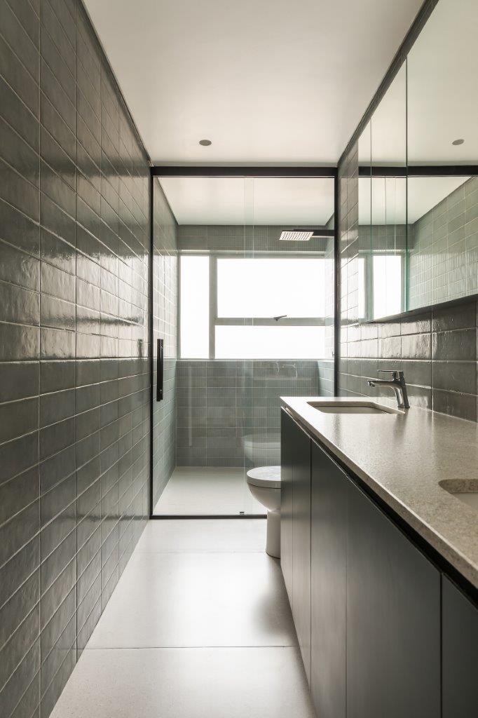 O piso de taquinhos original do apartamento foi mantido, criando uma conexão com a história do edifício. O contraste com o metal, material moderno presente na prateleira metálica, porta de vidro sanfonada, detalhes dos mobiliários e acabamentos das luminárias, confere um toque contemporâneo ao espaço. A prateleira metálica que emoldura a televisão possui um design leve e moderno, enquanto a porta sanfonada conecta a área social e a cozinha, permitindo integração e privacidade.