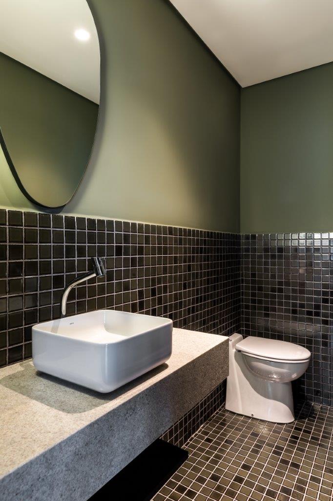 O principal pedido dos clientes era criar um espaço confortável e dinâmico para receber amigos e familiares. Para isso, algumas paredes foram removidas, ampliando a sala de estar e integrando-a com a sala de jantar. O sofá em ilha serve como elemento unificador, enquanto o banco que percorre toda a extensão da sala, revestido com azulejos desenhados por Rômulo Lass, é um dos destaques do ambiente.