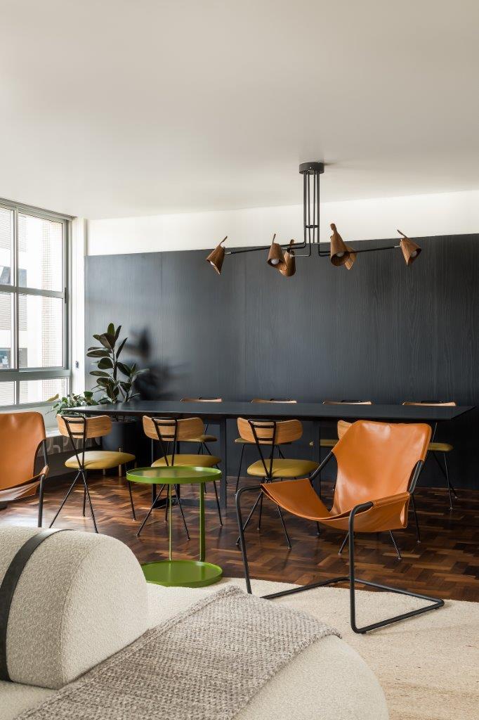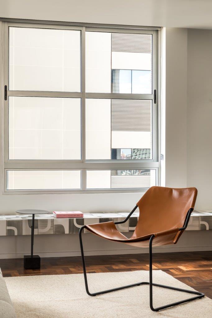 A paleta de cores neutra, aliada a mobiliários de design contemporâneo e moderno, como as Poltronas Paulistano, reforça a atemporalidade desejada para a residência. O resultado é um apartamento que celebra a história do edifício, mas também oferece um estilo de vida moderno e funcional.