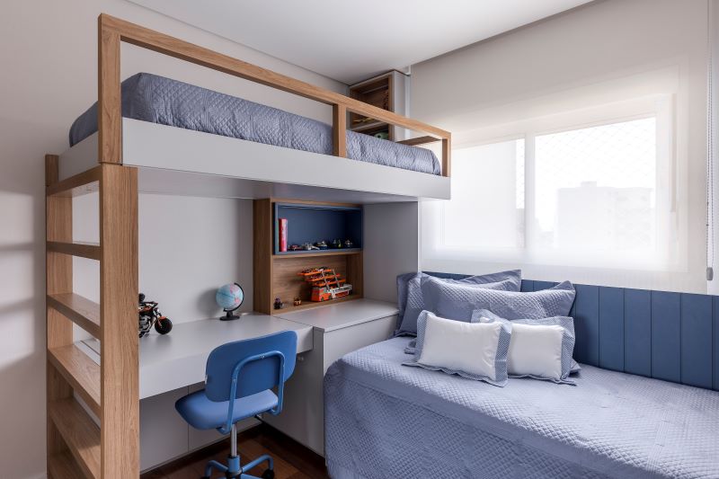 Para o filho, a predominância do azul sinaliza a serenidade da sua personalidade. Uma característica notável do ambiente é a marcenaria que engloba uma cama auxiliar suspensa – pensada para receber os amigos –, e que na parte superior entregou uma confortável escrivaninha para os momentos de estudo. Com a cama encaixada no ‘L’ formado na parede, destaque para o lambril azul de madeira incluído nessa área.