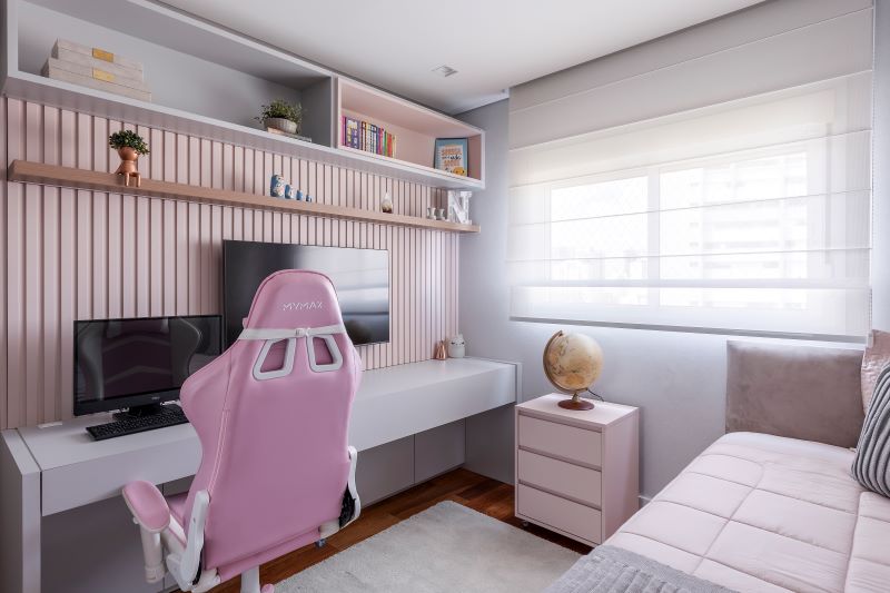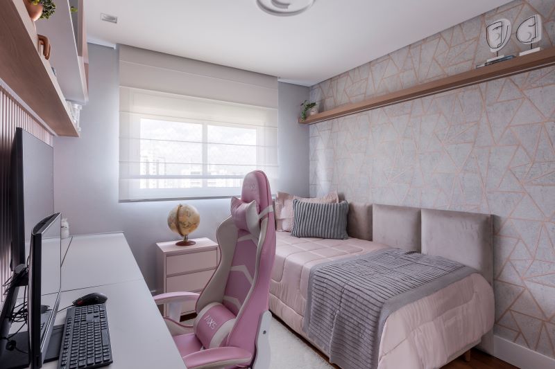 Ainda nesse décor pueril e romântico, os detalhes dourados do papel de parede brilham como pequenos raios de sol que dançam suavemente pelo local, concebendo um ambiente acolhedor e delicado com o rosa que se evidencia na cadeira gamer e outros itens pontuais do projeto.