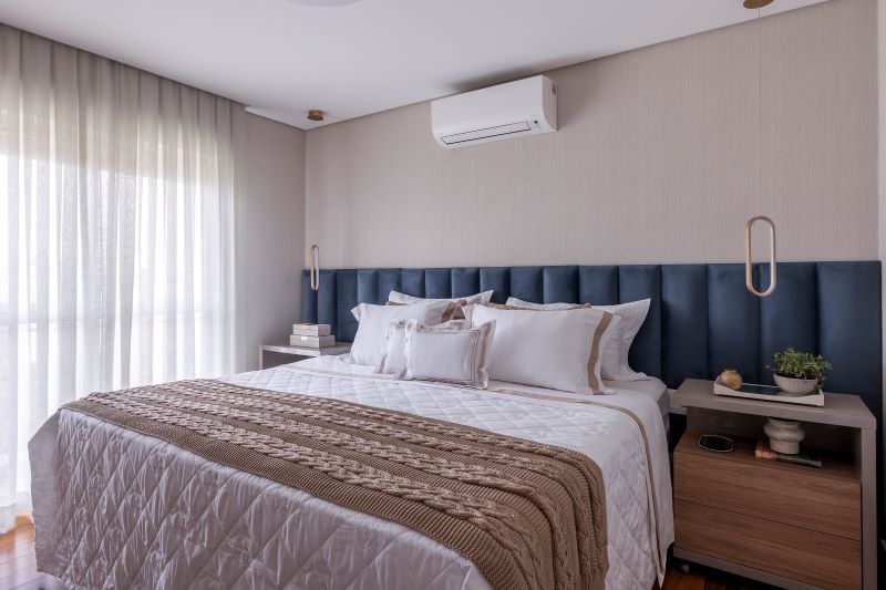 O quarto do casal, claro, seguiu a personalidade dos clientes. De estilo sofisticado, aconchegante e moderno, a composição focou nos tons neutros, com papel de parede em linho que arremata com a cabeceira azul.
