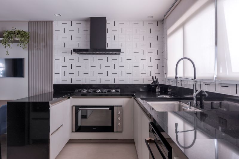 Separada da área social, a cozinha, com direito a uma pequena copa para as refeições diárias dos moradores, deu abertura para uma combinação clássica e atemporal – tanto na moda, como na arquitetura de interiores: o mix entre o preto e cinza. Para acompanhar a marcenaria cinza clara o preto marcou presença no granito preto absoluto revestindo todas as bancadas, e nos eletrodomésticos.