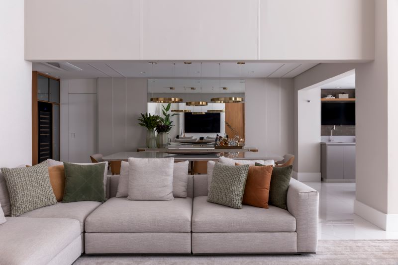 Na conexão entre os ambientes, a profissional também considerou a instalação de recursos luminotécnicos, com a iluminação em toda a sanca que acompanha o pé-direito mais alto e na região da parede verde por meio dos perfis de LED que também atuam como recurso decorativo. “Eu gosto muito quando temos a possibilidade de incluir a parede verde nos projetos, pois adicionar o verde para dentro de nossas casas, é uma prática que contribui para essa ligação entre o humano e o natural de que tanto precisamos”, diz Marta