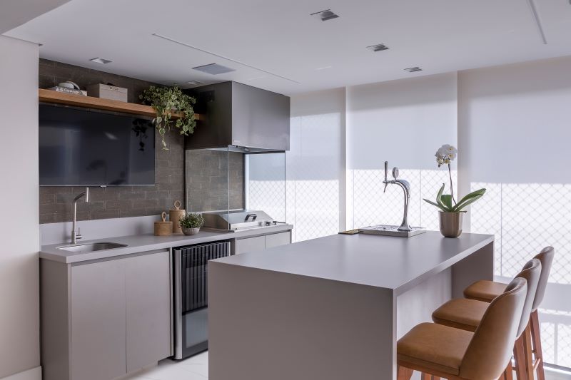 Além da área social, com o balanço suspenso – que se configura como um chamado para as horas de relaxamento –, e as poltronas giratórias de couro, que atendem os dois ambientes, a divisão da varanda também considerou a execução de um espaço gourmet com churrasqueira, chopeira elétrica em torre na ilha e duas cervejeiras, que nitidamente expressam as preferências do cliente.