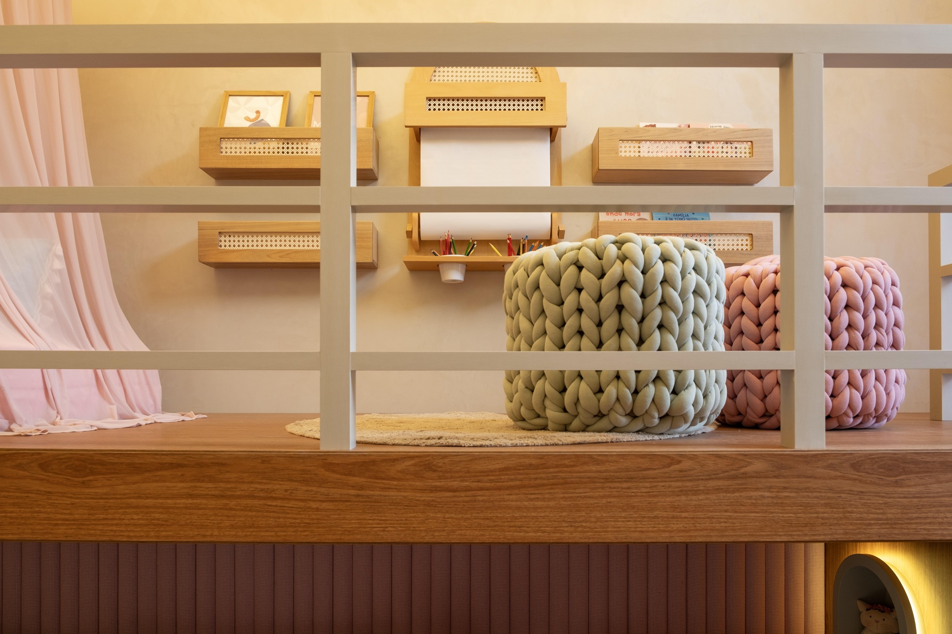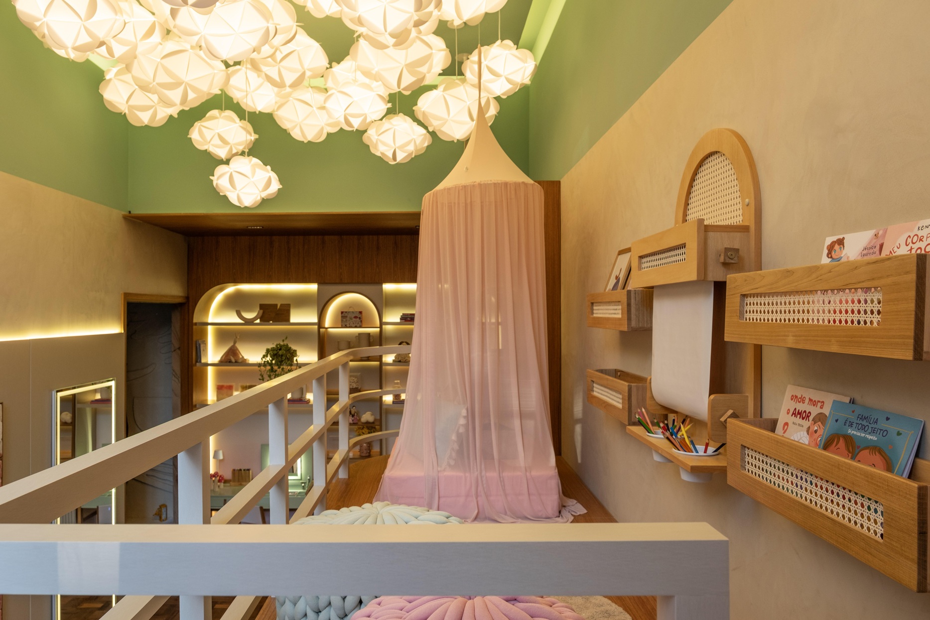 A paleta de cores, que mescla tons pastel, verdes naturais e terrosos suaves, foi especialmente escolhida para estimular o relaxamento, a criatividade e o bem-estar. “O desafio era fugir do óbvio sem perder o encantamento da infância. Buscamos equilíbrio entre o lúdico e o sofisticado, entre o funcional e o afetivo”, comenta Marta.