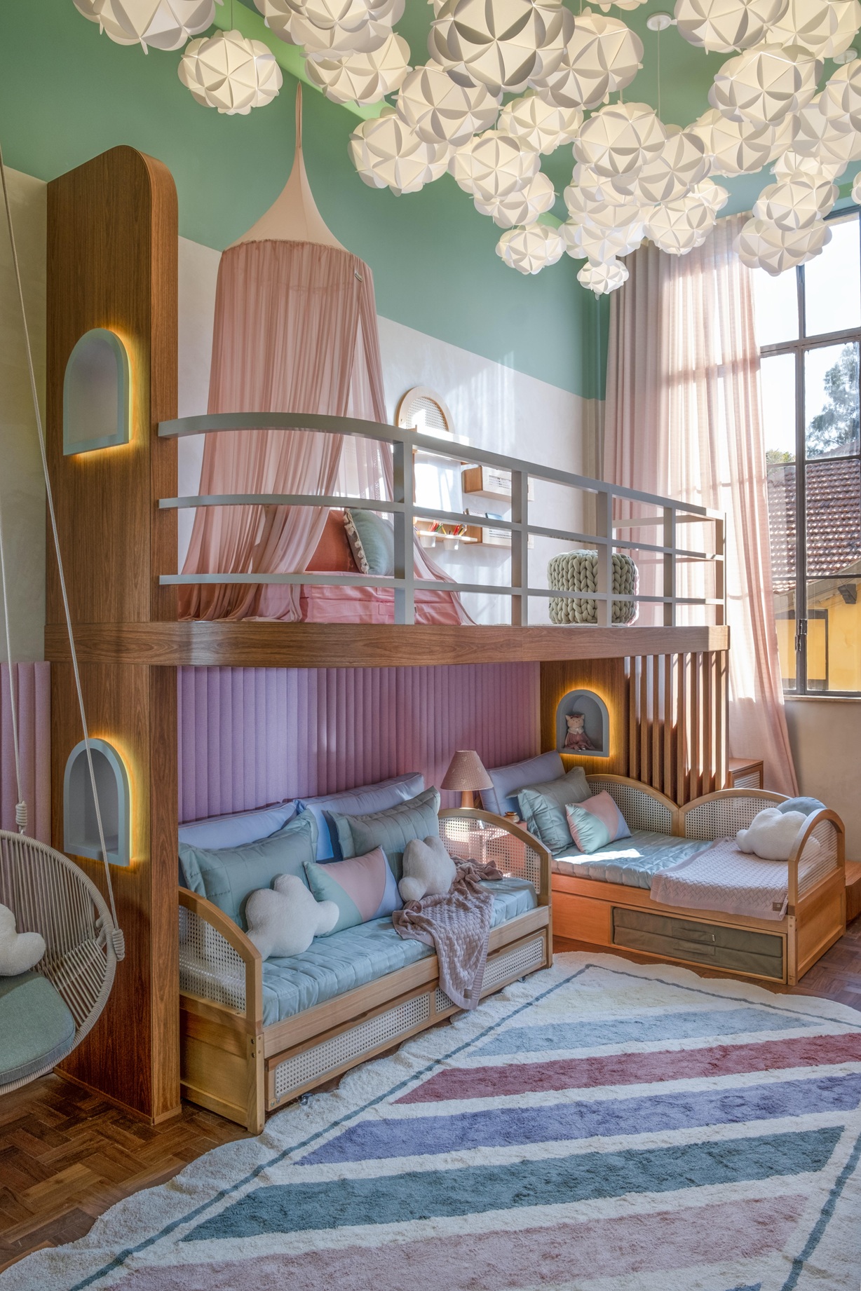 Inspirado em dois universos distintos que se complementam – a leveza do céu e a solidez da terra –, o espaço foi cuidadosamente pensado para equilibrar aconchego, funcionalidade e diversão entre irmãs de idades diferentes. Cada detalhe foi desenhado para estimular a criatividade e garantir que as crianças se sintam acolhidas e livres para explorar, mantendo o conforto e a harmonia do convívio compartilhado.