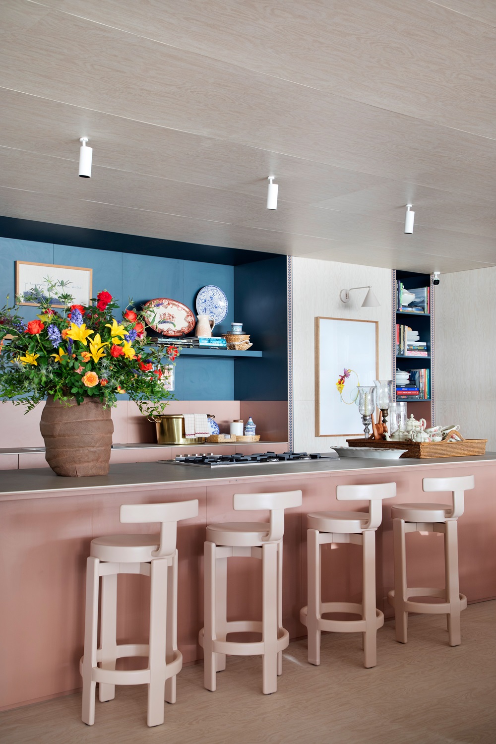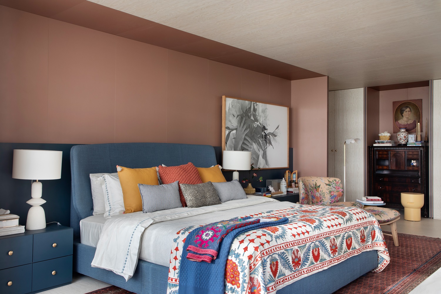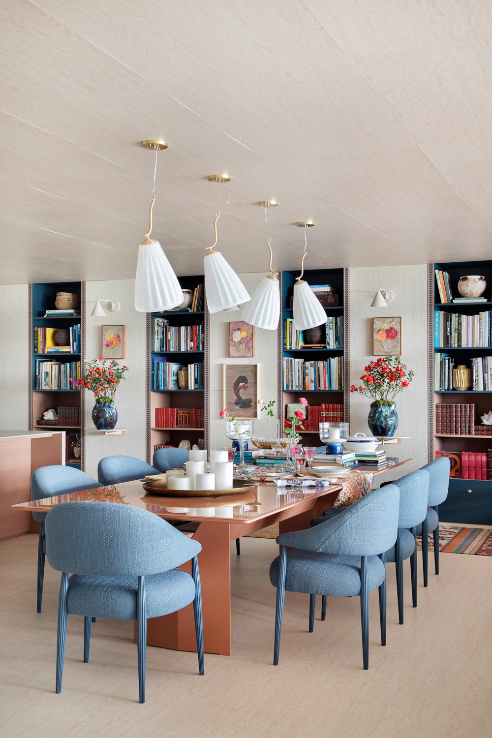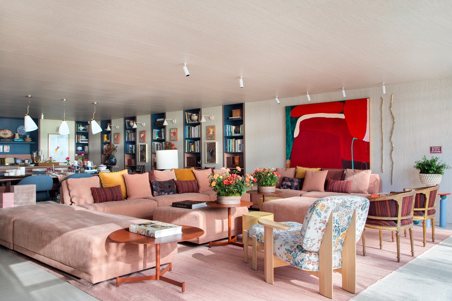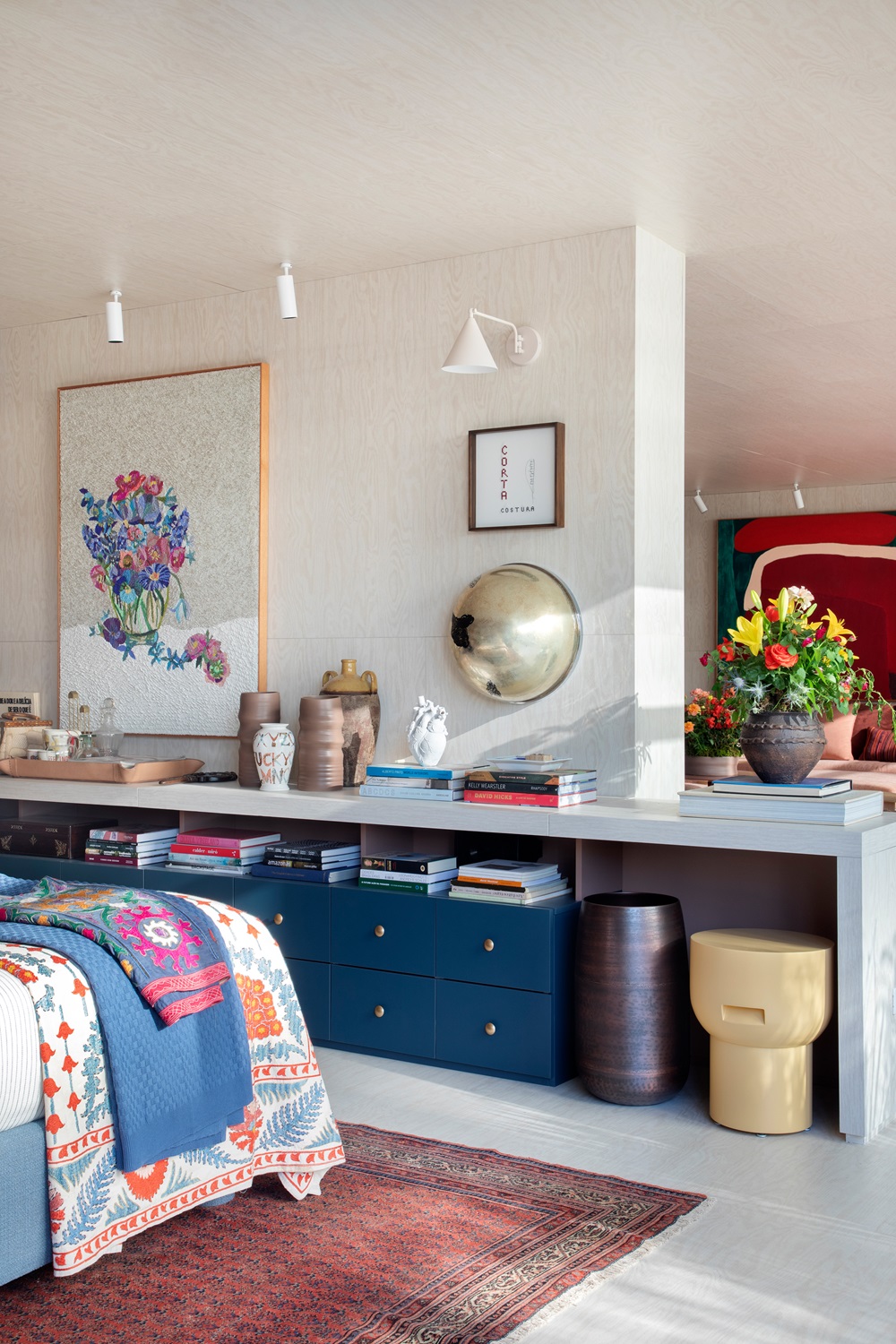 Móveis de bambu e palha da Alex Cerello agregam elegância ao ambiente, enquanto tapetes da By Kamy completam a decoração com um toque de aconchego. A Galeria Teo, especializada em mobiliário de antiquariato, contribuiu com peças de diferentes épocas e estilos, reforçando a riqueza e a diversidade do espaço.