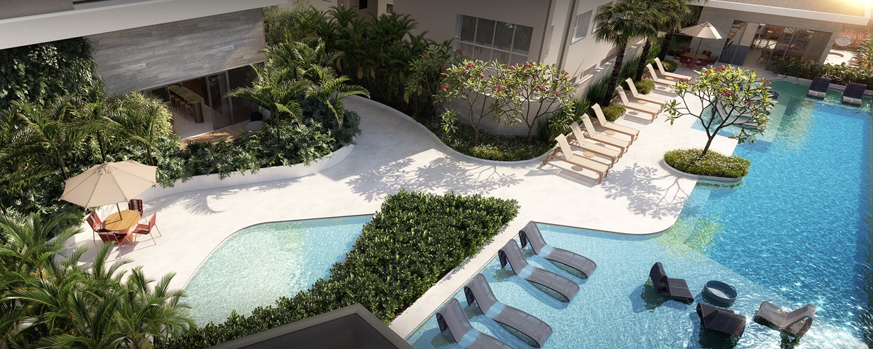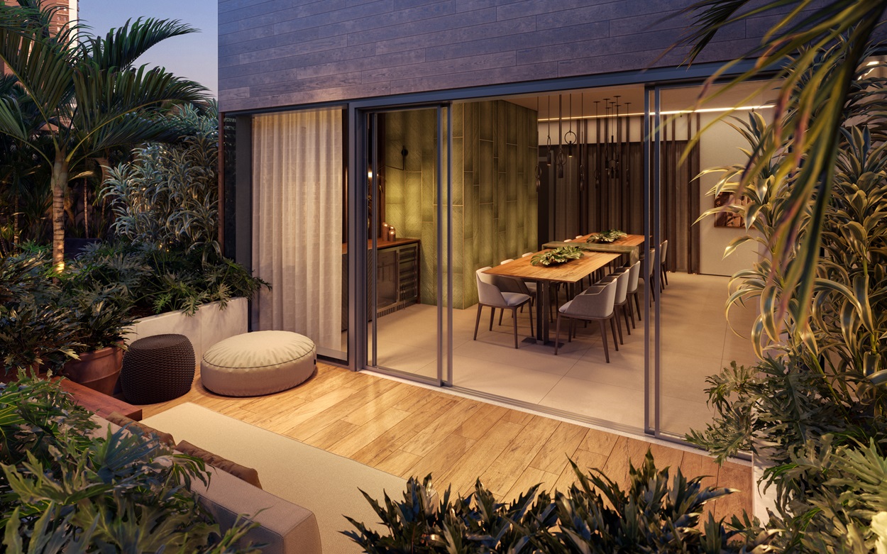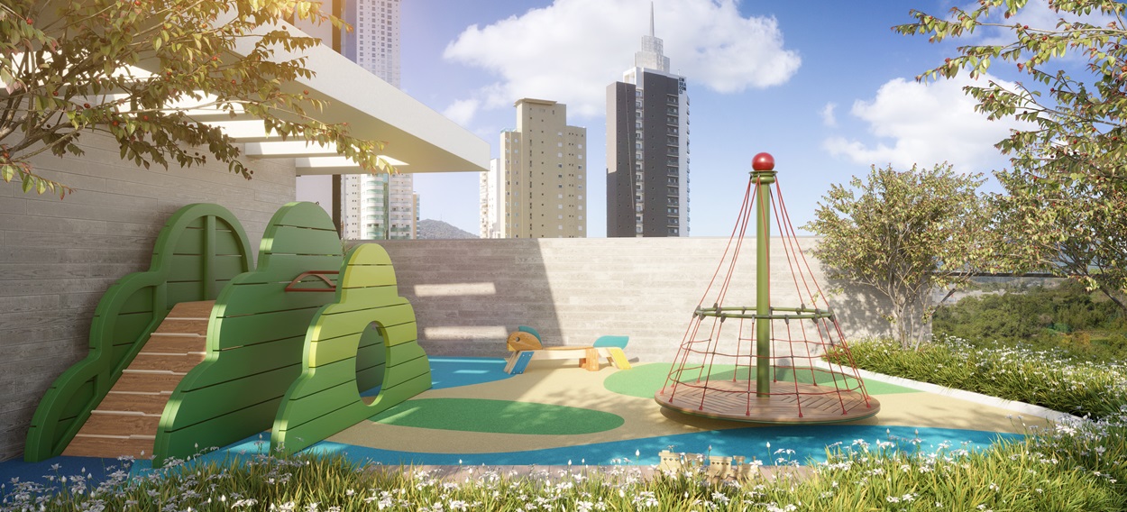 • Áreas comuns: O playground conta com árvores frutíferas para atrair pássaros e divertir as crianças. A piscina, com revestimento em cristal pool, simula uma praia particular e é cercada por jasmins-manga, que perfumam o ambiente.