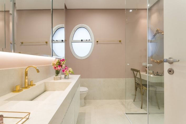 O tom rosa claro criou um cenário leve e etéreo nesse banheiro com ares de casa de boneca. A cor contribuiu com o ar lúdico do cômodo que conta com janelas circulares e um espelho antigo em um cantinho personalizado para maquiagem. | Projeto: Spaço Interior | FOTO: Kadu Lopes
