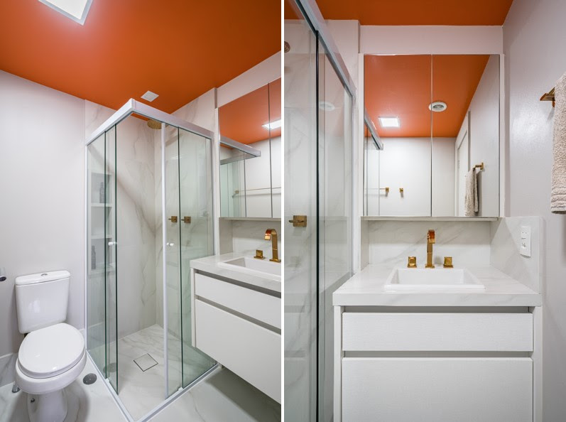 O revestimento marmorizado do piso e o teto colorido de laranja transmitem ao projeto uma irreverência ímpar. O laranja confere ao banheiro um caráter personalizado e eleva a energia do cômodo, provando que é possível inovar na decoração do cômodo adicionando um toque de cor! | Projeto: Spaço Interior | FOTO: Kadu Lopes