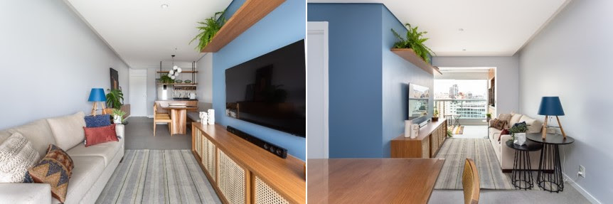 O tom azul claro se fez presente na sala de estar deste apartamento compacto localizado no bairro Liberdade, na cidade de São Paulo. A parede colorida deu um toque especial ao local da TV, assim como ao rack e à prateleira superior. A coloração segue até o corredor que leva aos dormitórios e ao banheiro. | Projeto: Studio Tan-gram | FOTO: Estúdio São Paulo