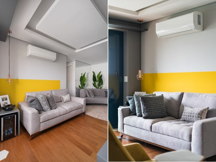 Quebrando os tons neutros do living com uma pintura amarela em formato retangular, a parede desse apartamento ganhou um ar mais moderno e divertido, possuindo um projeto baseado no Feng Shui. A própria cor amarela possui propriedades estimulantes, proporcionando alegria ao ambiente de descontração e descompressão que é o living. | Projeto: Spaço Interior | FOTO: Kadu Lopes