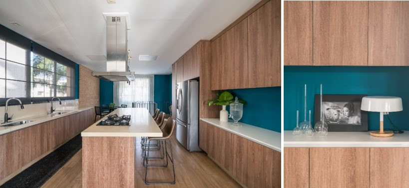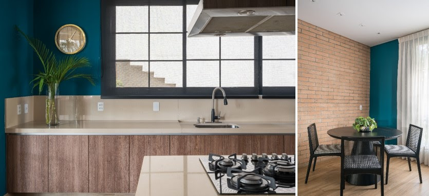 A cor vibrante, num tom de verde índigo, permite que a marcenaria dos armários, o da pia e a parede de tijolinhos do revestimento tenham o destaque que merecem, colocados em destaque graças à base proporcionada pela parede colorida. | Projeto: Spaço Interior | FOTO: Kadu Lopes
