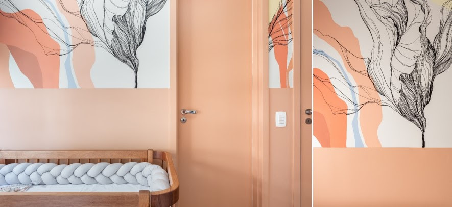 Neste quartinho de bebê, além das pinturas na parede, o rosé foi a cor escolhida para colorir as portas e a parte inferior da parede, inspirando ao aconchego e ludicidade. | Projeto: Studio Tan-gram | FOTO: Estúdio São Paulo