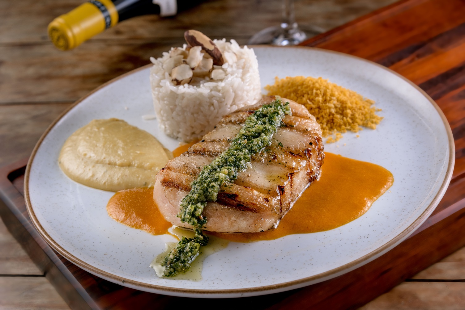 Robalo com crosta de amêndoas no Fahrenheit