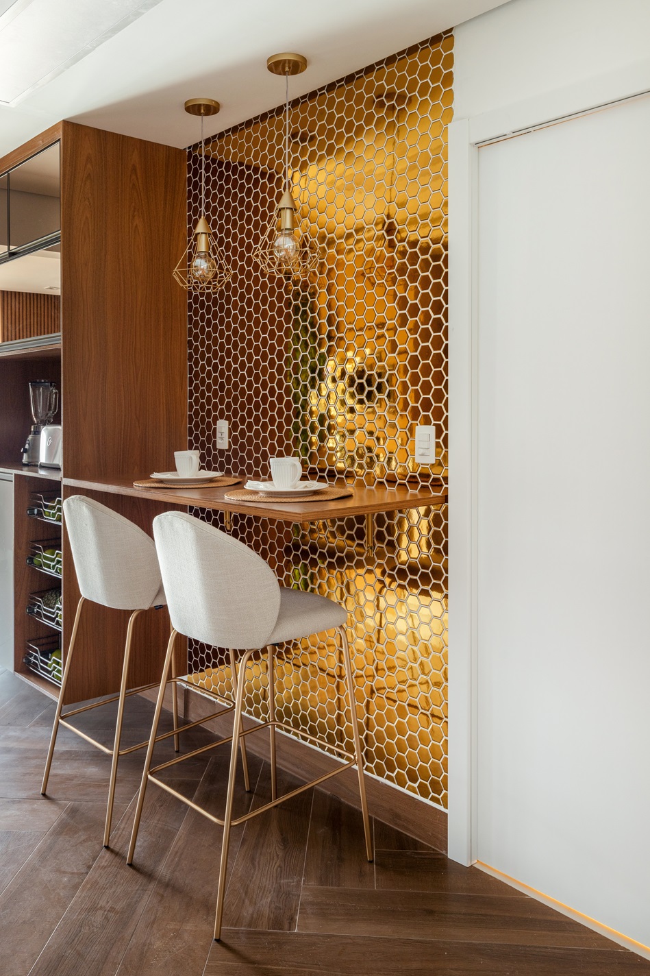 A cozinha, agora integrada à varanda, é um dos destaques do projeto. O porcelanato Copertino Acetinado em escama de peixe e o Castel Tasso Lux com veios marmorizados criam um ambiente elegante e atemporal. As pastilhas hexagonais de porcelana Gold AC adicionam um toque de sofisticação e personalidade ao espaço, tornando-a o coração da casa.