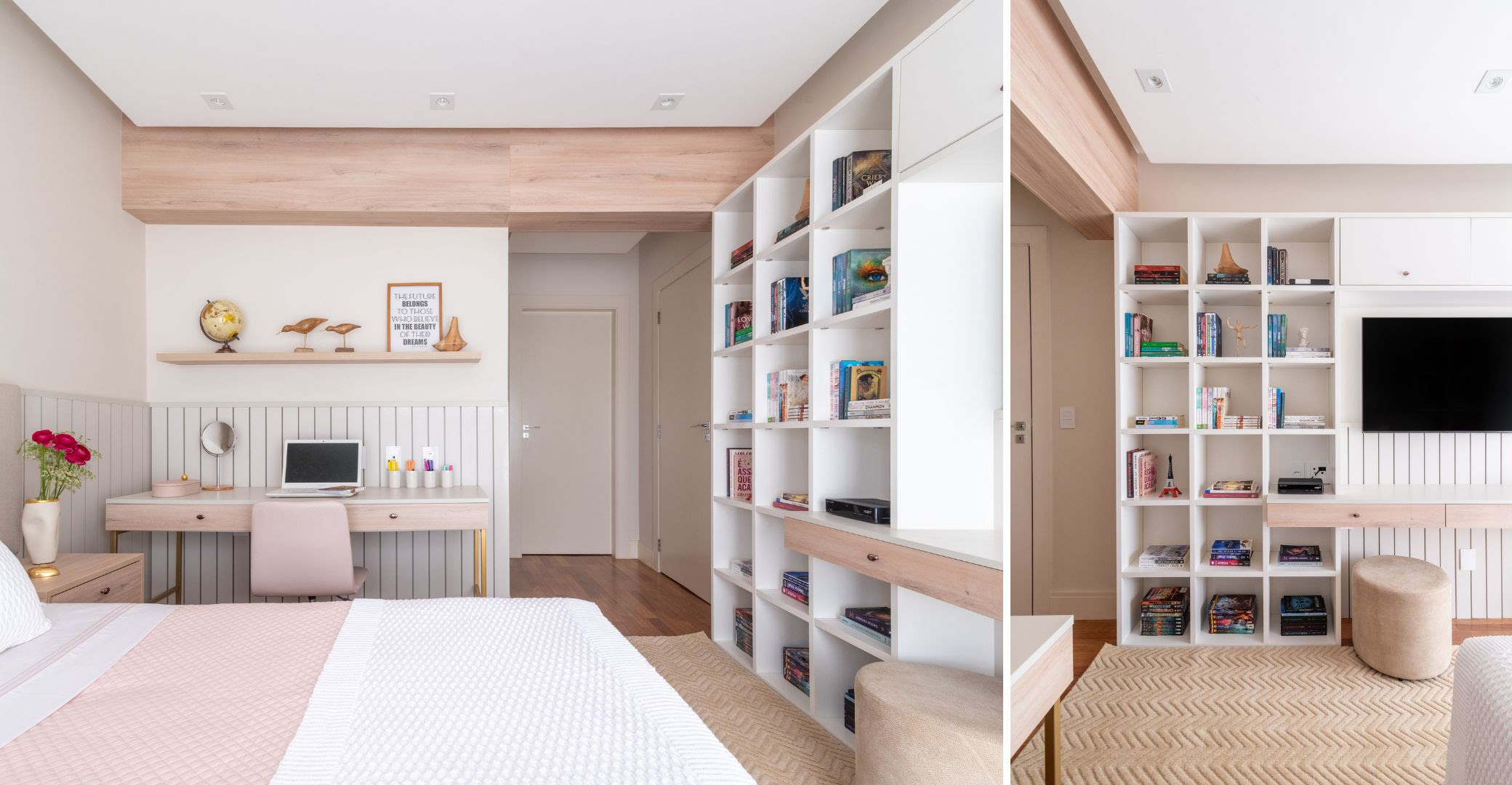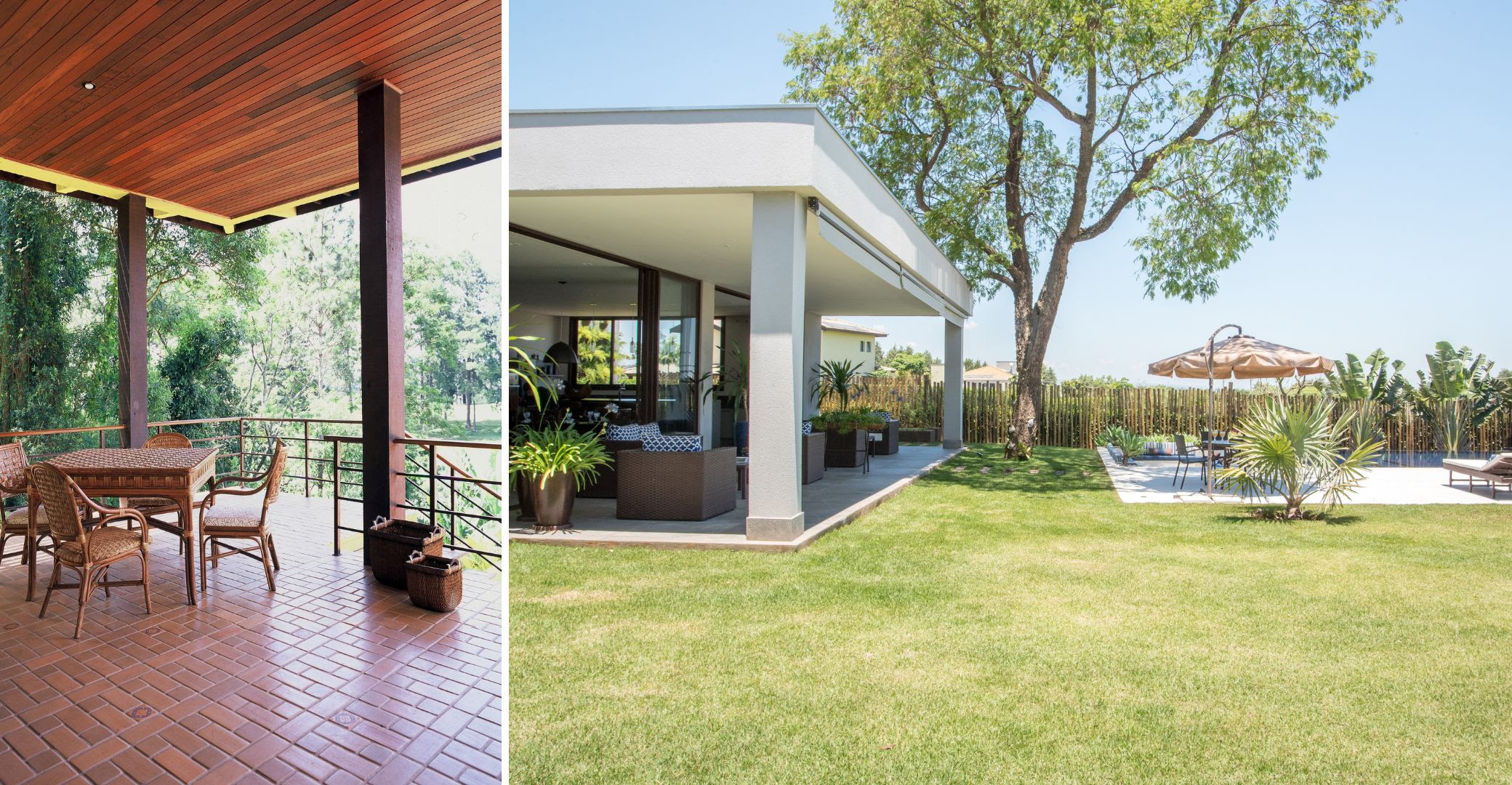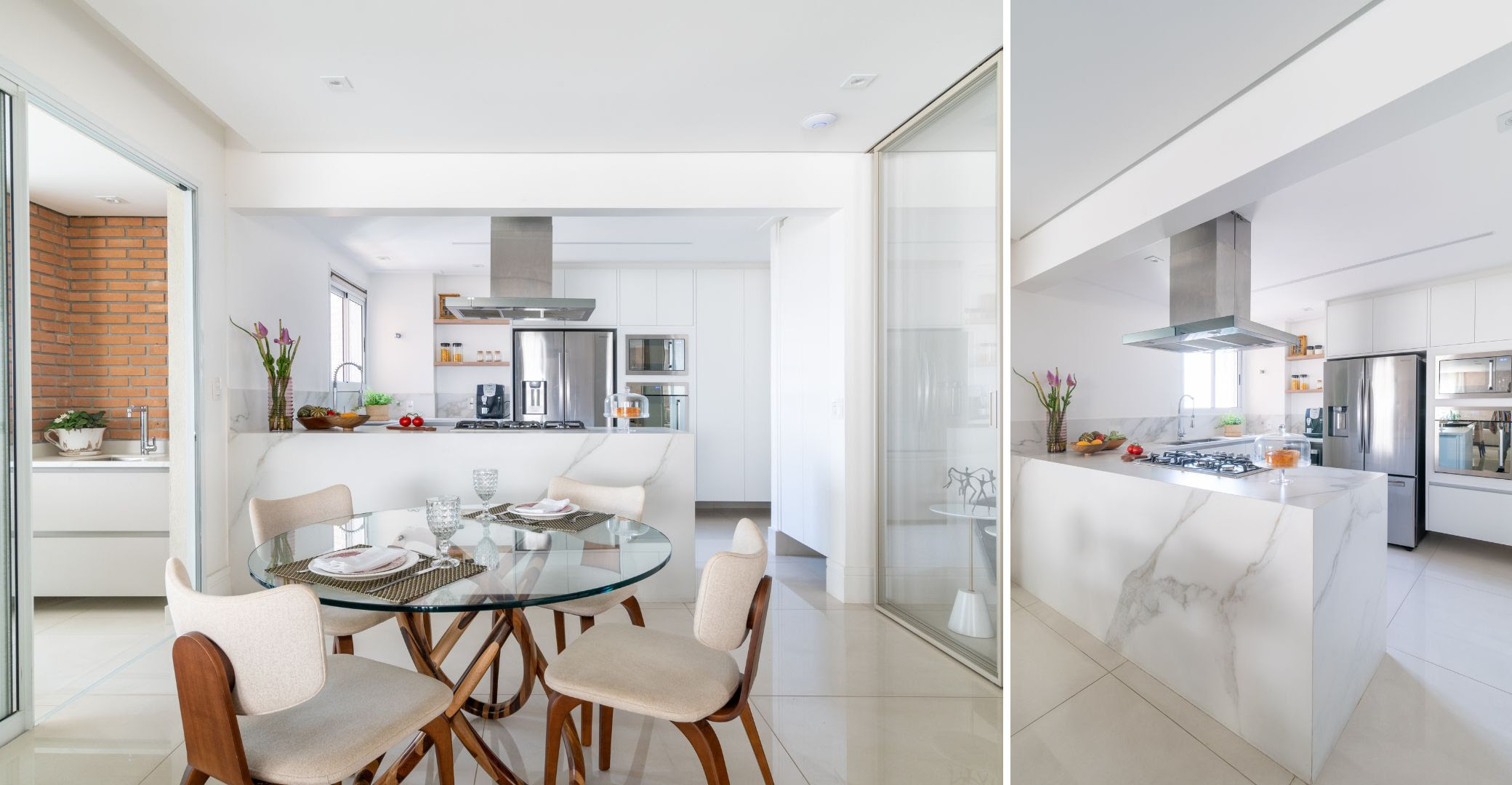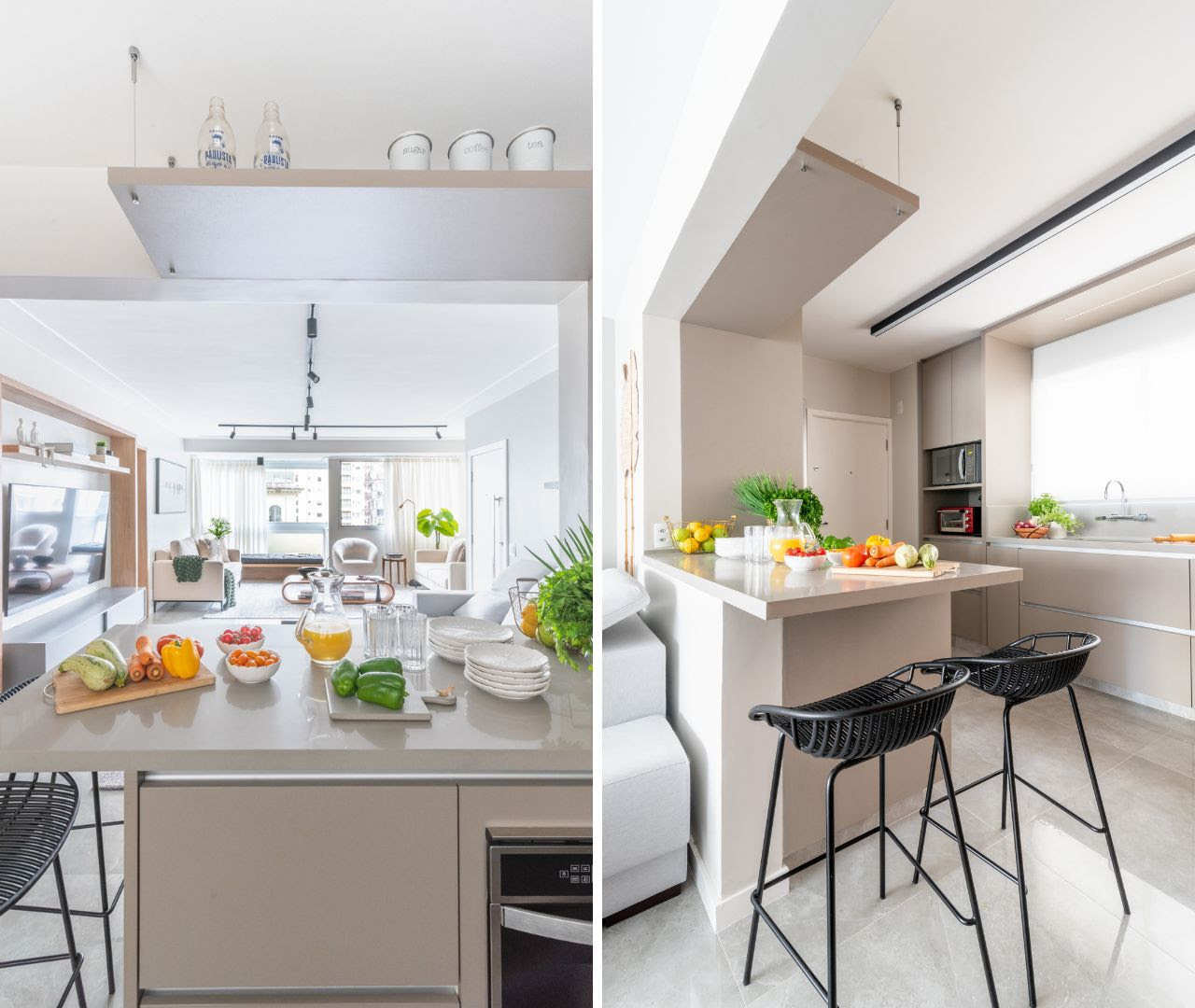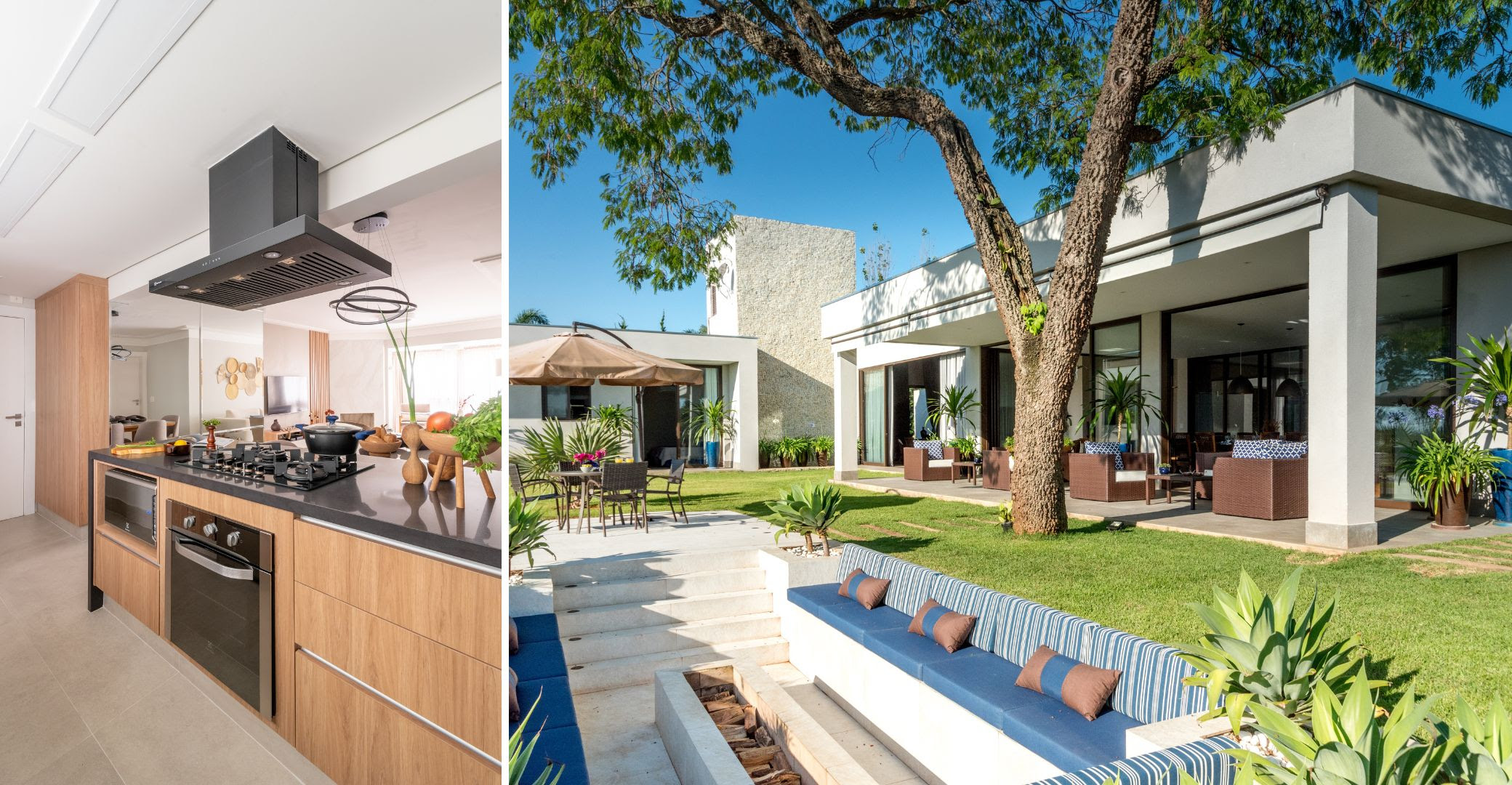 Nos projetos com pilares externos, a arquiteta destaca seu papel como elementos de transição entre interior e exterior, marcando fachadas e emoldurando varandas. Além de sustentarem, contribuem para o ritmo visual e o diálogo entre os volumes. Já as vigas, com sua função de equilibrar e distribuir cargas, também são aliadas na leitura espacial. Elas conduzem o olhar, reforçam a sensação de amplitude e organizam o layout de forma natural e fluida.