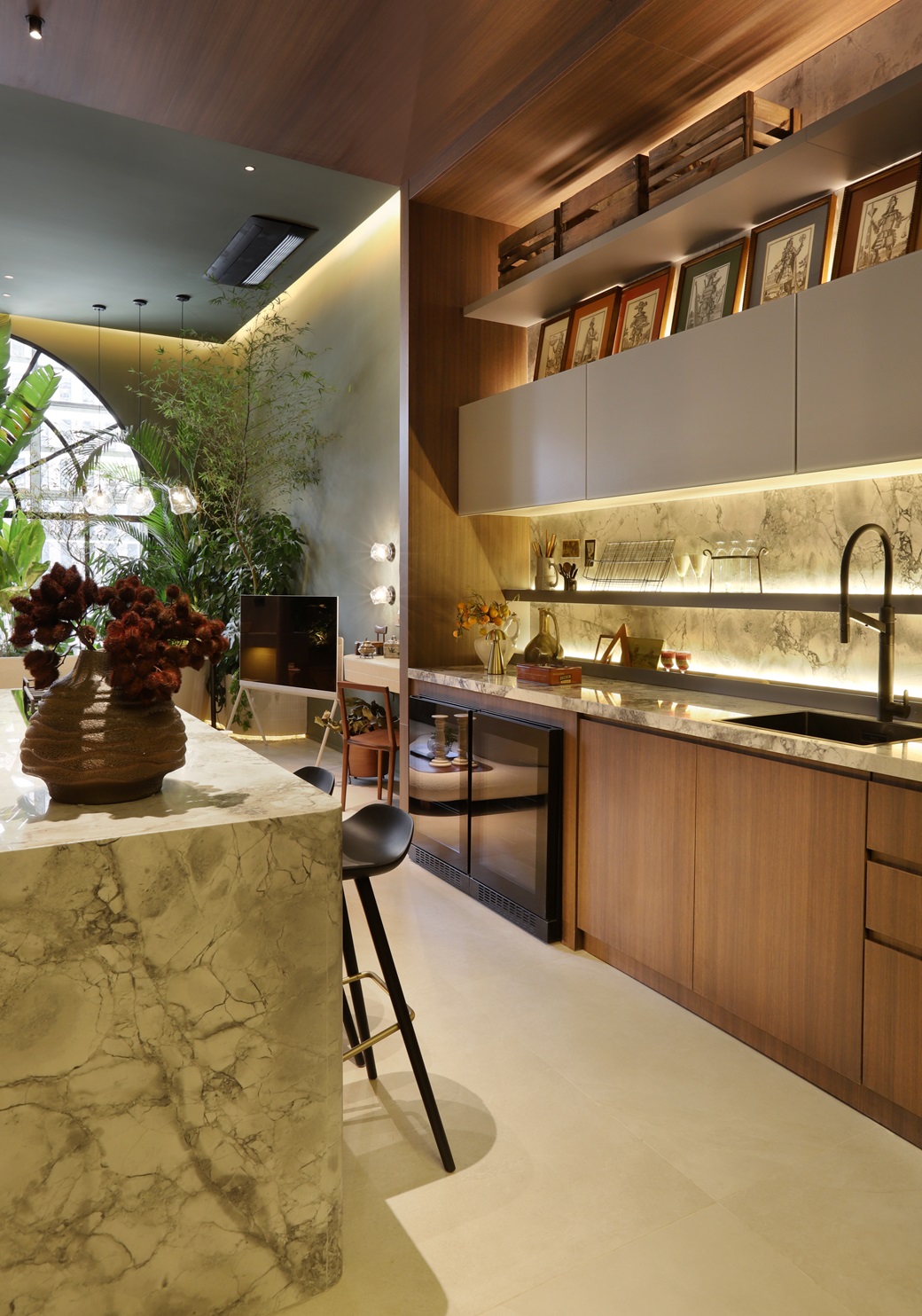 Refúgio Ancestral: No bar Caracol, a arquiteta Gabriela Prado reinterpreta o uso dos vitrais, instalando-os no teto. As estantes no acabamento Rovere Carbone e o painel ripado curvo em melamínico, ambos da SCA Jardim Europa, conferem modernidade e aconchego ao espaço.