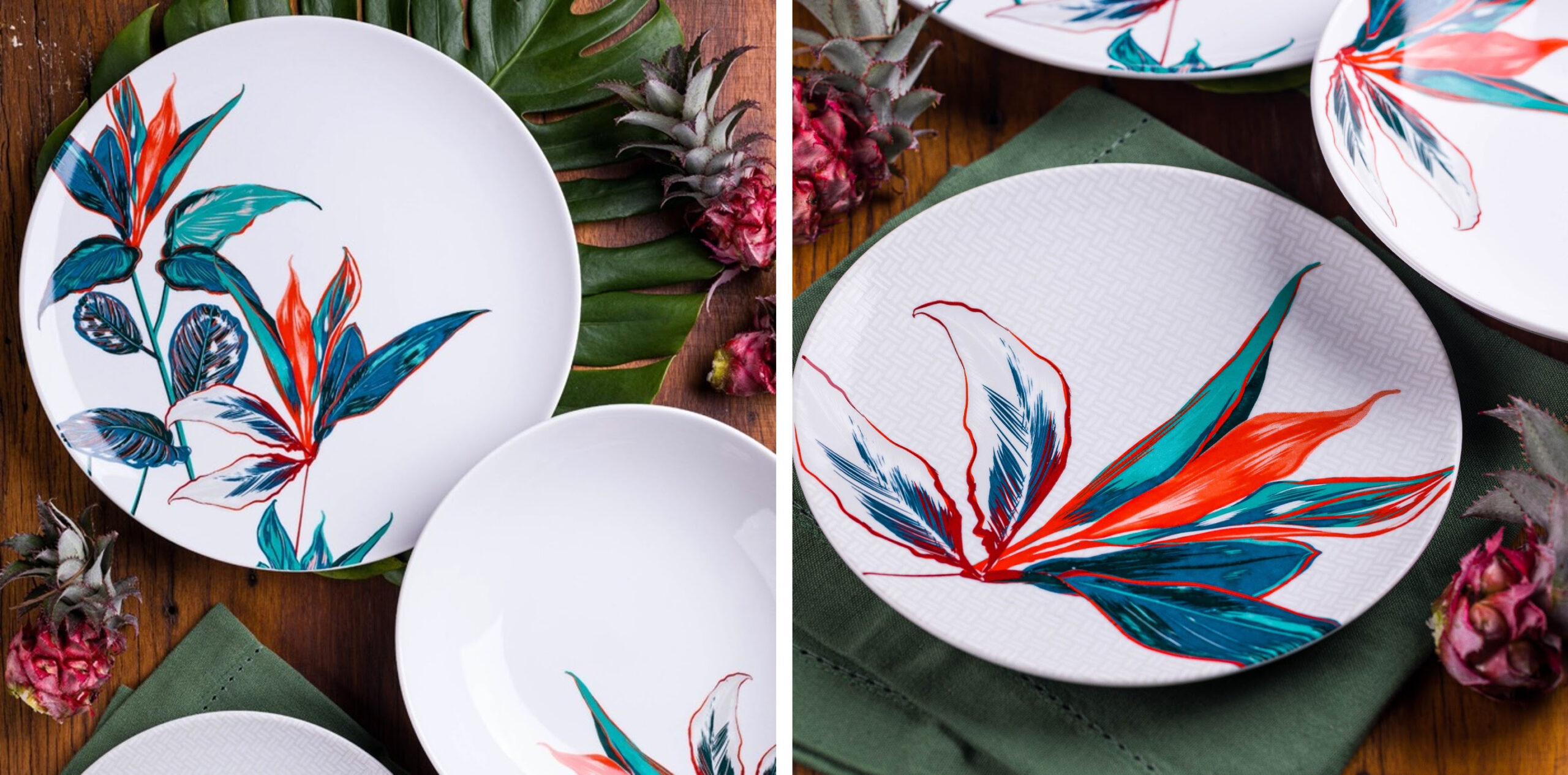 - Germer Porcelanas: A linha Tropical da Germer Porcelanas traz frescor e alegria para as refeições, com suas estampas de folhas grandes e vibrantes.