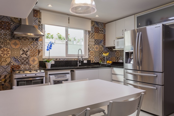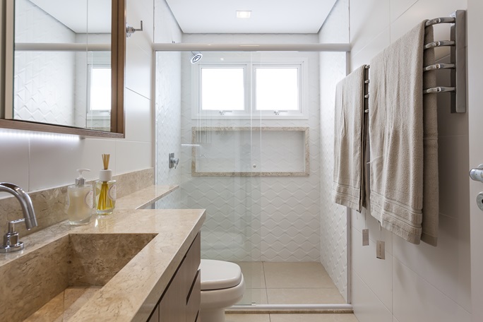 A funcionalidade também foi uma prioridade no projeto. O buffet sob a escada otimiza o espaço de forma inteligente, enquanto a cozinha planejada aproveita cada centímetro para garantir praticidade no dia a dia. Nos banheiros, o estilo clean e atemporal é realçado por nichos revestidos, bancadas em mármore e acabamentos de alta qualidade.