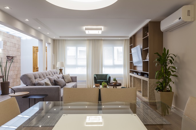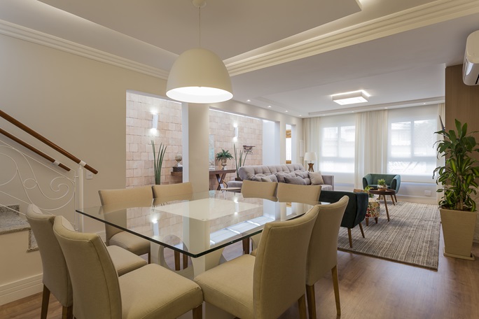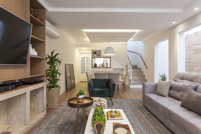 O coração da casa agora é a área social, onde a integração dos ambientes é a protagonista. A remoção de paredes na sala de estar permitiu a conexão com o corredor externo, onde uma claraboia foi instalada para banhar o espaço com luz natural. A sensação de amplitude é reforçada pela paleta de cores claras e pelo uso de espelhos estrategicamente posicionados.