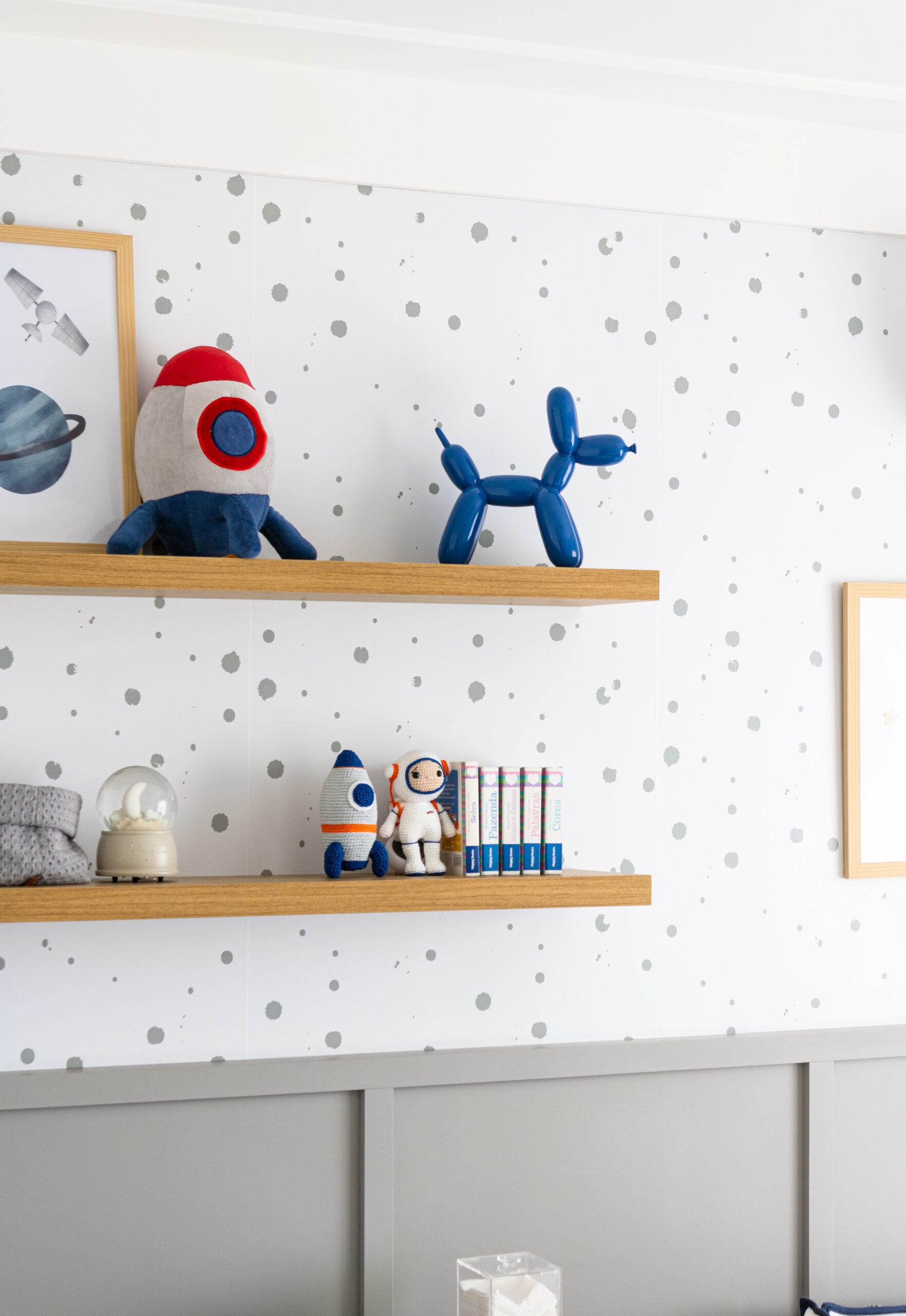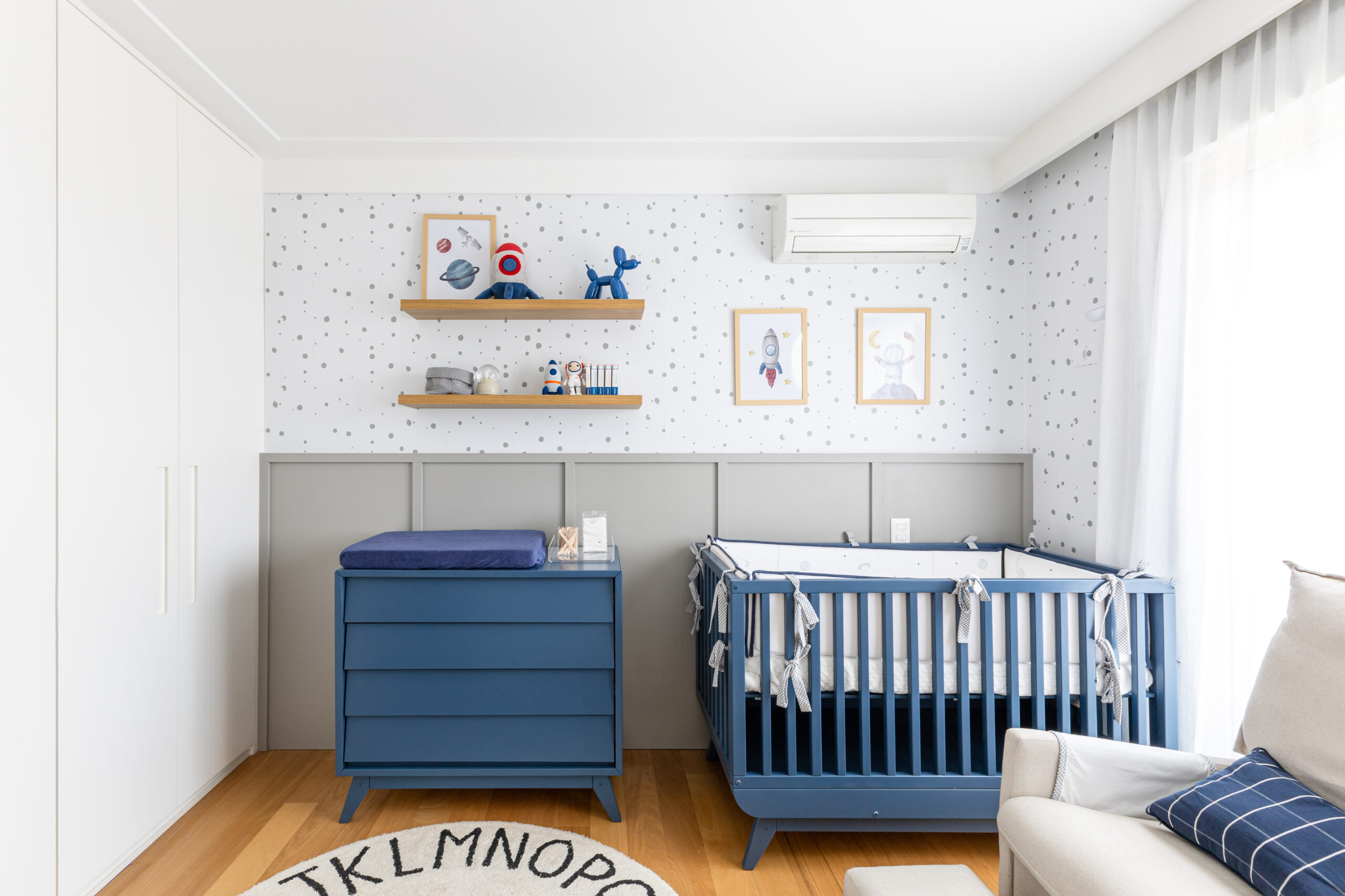 Conduzido pela arquiteta Virginia Caldas, o projeto envolveu a revitalização do berço e da cômoda existentes, além de novas pinturas, papéis de parede e marcenarias inspiradas no universo. A paleta de cores mescla tons de azul escuro, cinza e madeira, criando uma atmosfera acolhedora e moderna.