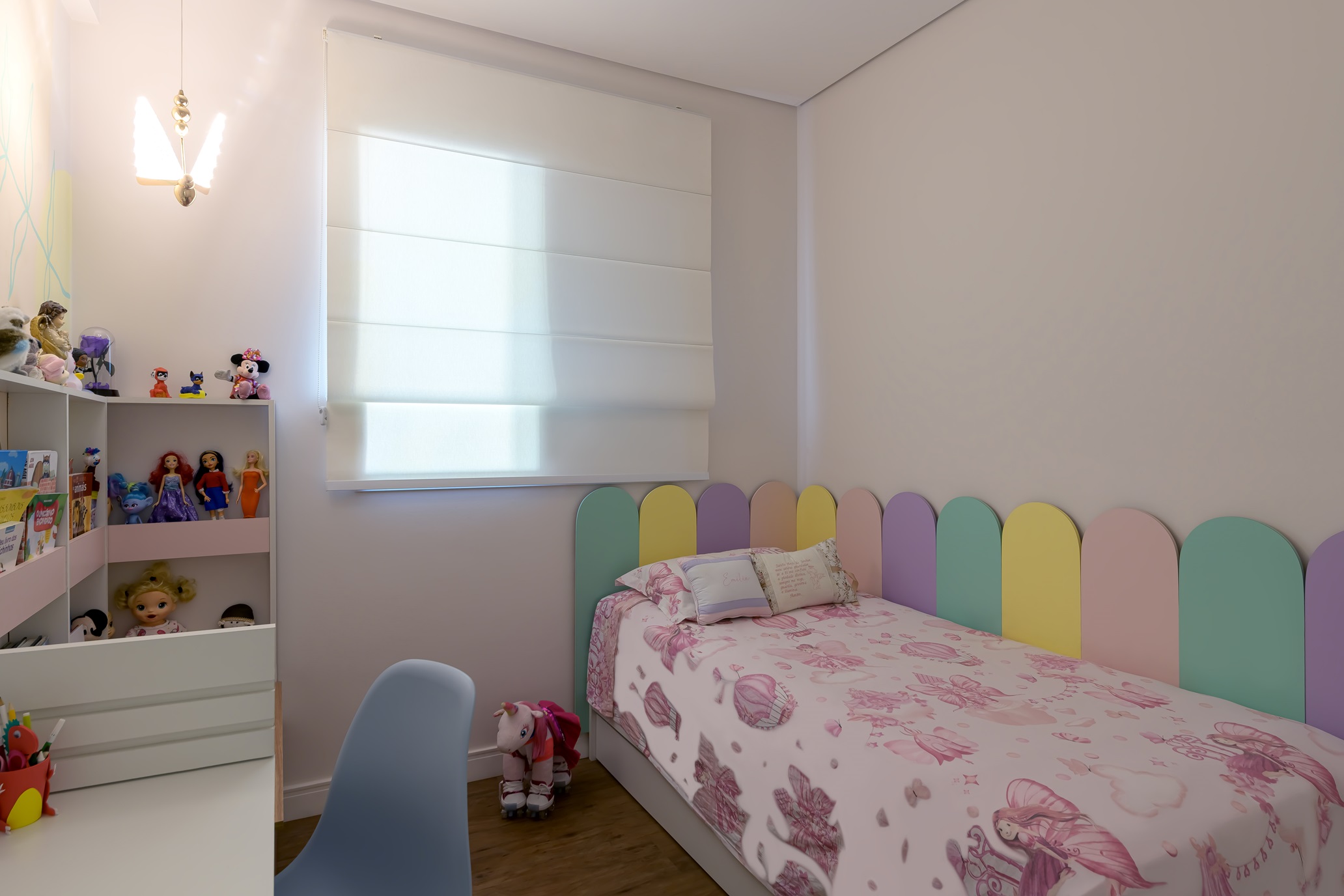• Um mundo de descobertas: Inspirado na pedagogia Montessori, o quarto das meninas se transforma em um espaço de aprendizado e autonomia. Os nichos acessíveis, as cores vibrantes e os materiais naturais estimulam a exploração e o desenvolvimento dos sentidos.