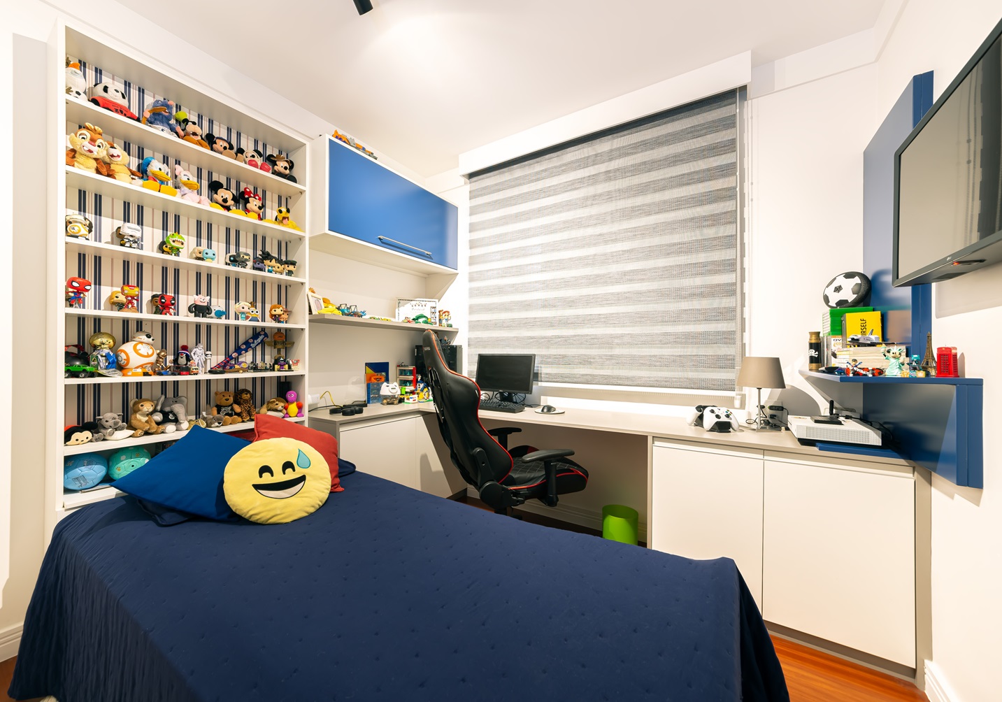 • Um universo lúdico: Para os meninos mais aventureiros, um quarto com cores vibrantes e elementos lúdicos é a escolha perfeita. As prateleiras coloridas, os brinquedos expostos e os espaços de armazenamento incentivam a organização e a criatividade.