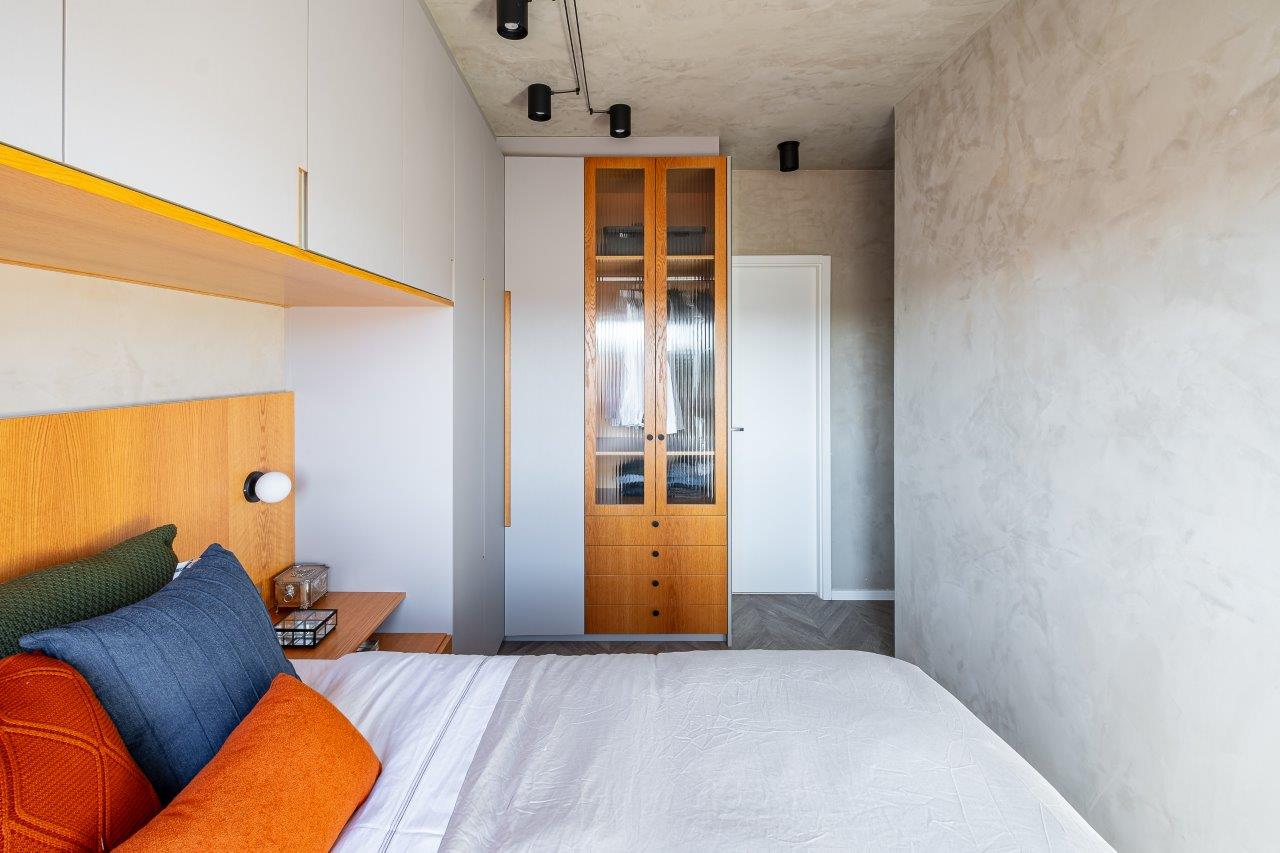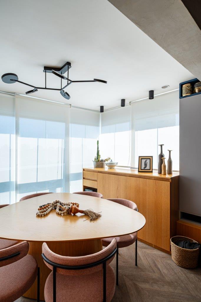 Em relação às adaptações técnicas, um ponto crucial foi a relocação do ponto de TV. Originalmente posicionado na parede divisória entre sala e cozinha, ele foi movido para a parede adjacente ao dormitório, permitindo que o casal desfrute de seus programas favoritos tanto do sofá quanto da bancada da cozinha. A iluminação também recebeu atenção especial, com a escolha de plafons de sobrepor e fios aparentes, evitando o rebaixamento do teto e preservando a amplitude vertical do apartamento.