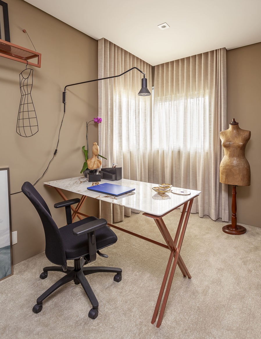 O home office de Juliana, antes um ambiente comum, foi transformado em um verdadeiro estúdio para gravações e reuniões online. A arquiteta optou por uma paleta de cores sofisticada, com detalhes em bronze, cinza e marrom, que transmitem elegância e profissionalismo. A mesa de trabalho, desenhada sob medida, combina metalon bronze e mármore, enquanto a estante, com acabamento em bronze, serve como cenário para os vídeos.
