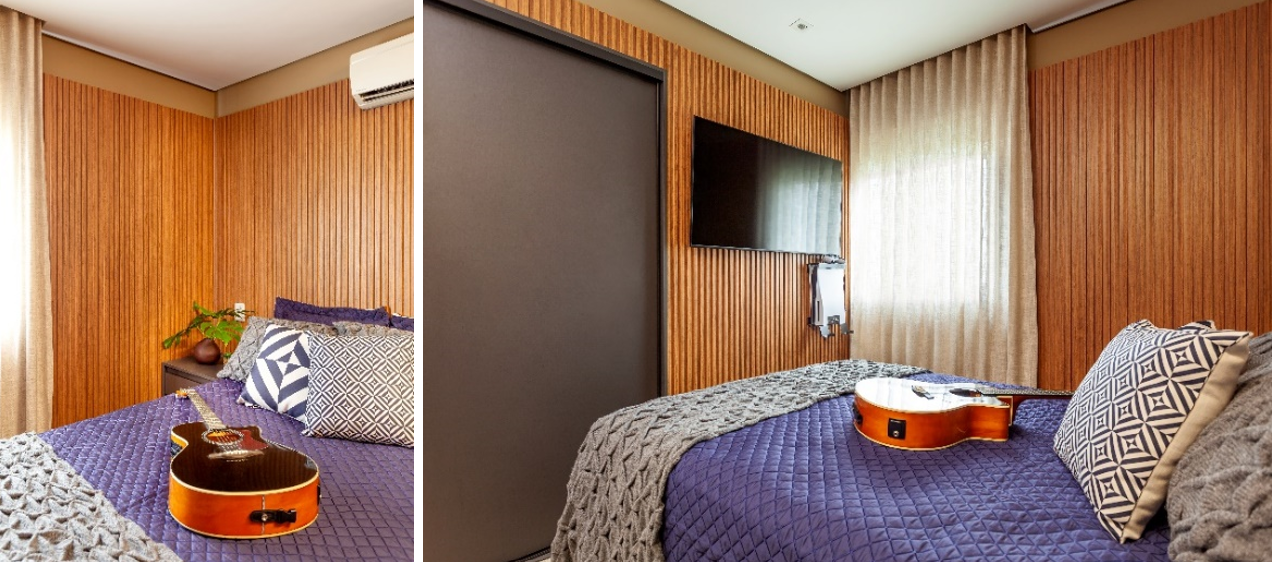 O quarto do filho de Juliana, Diego, um jovem alto, apresentava um desafio: a cama era pequena e não atendia mais às suas necessidades. A arquiteta encontrou a solução ideal: uma cama sob medida com 2,10m de comprimento. Além disso, foi criado um armário embutido na parede, com nichos amplos e espaçosos, para armazenar todos os pertences de Diego.