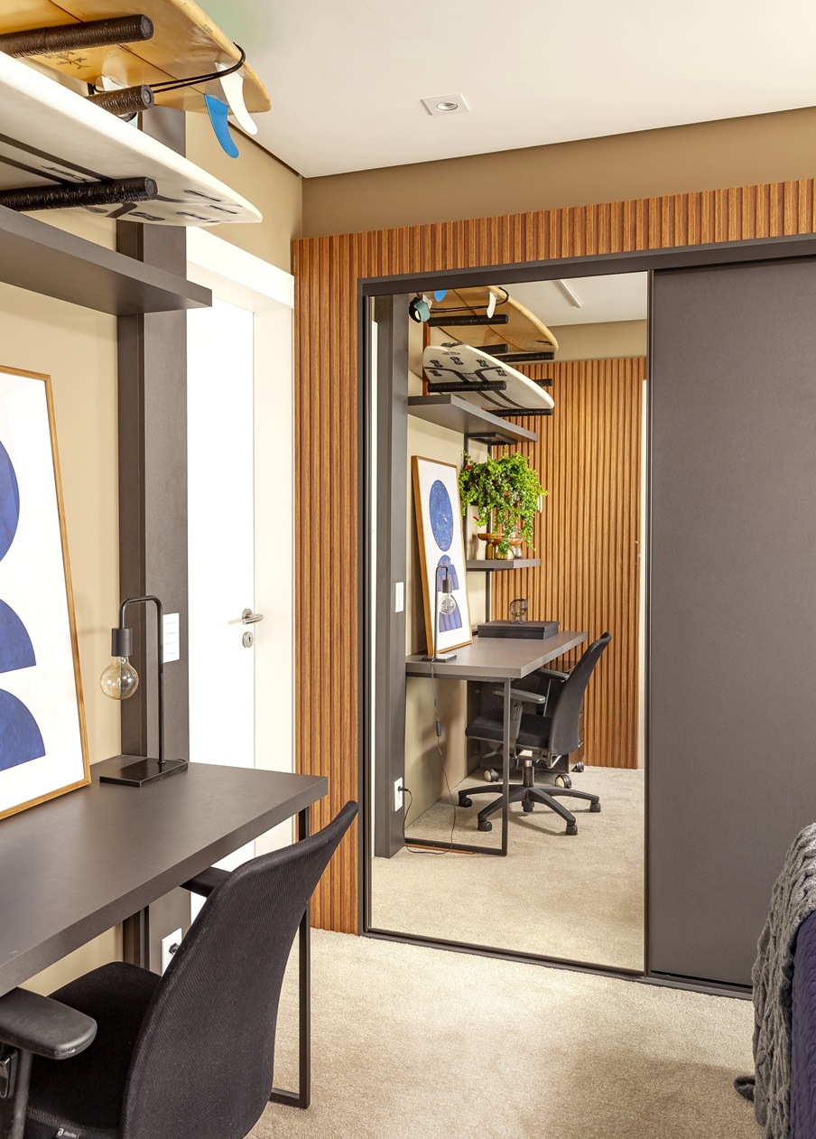 Uma das decisões mais ousadas do projeto foi a inversão dos ambientes. O que antes era o escritório, tornou-se o quarto de Diego, e vice-versa. Essa mudança permitiu otimizar o espaço e criar ambientes mais funcionais e personalizados.