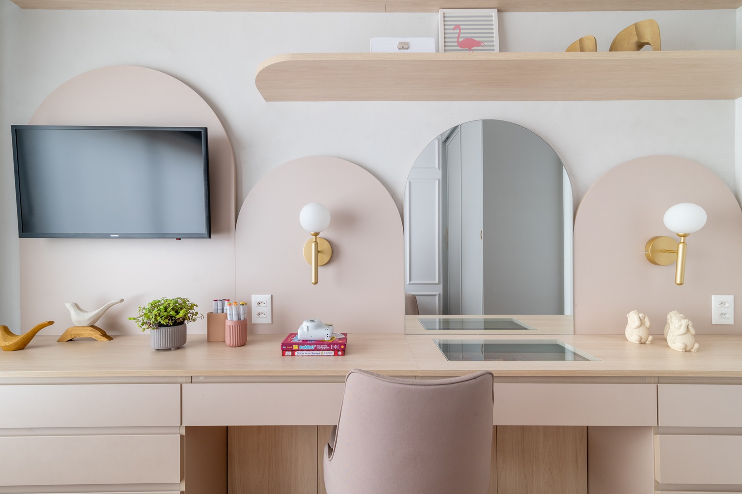 Cada dormitório foi cuidadosamente planejado para refletir as necessidades e gostos pessoais dos moradores. Nos quartos das crianças, a marcenaria foi essencial para criar soluções práticas, como prateleiras, escrivaninhas e nichos otimizados para estudo e lazer. Já na suíte master do casal, um amplo closet integrado à penteadeira foi projetado para unir praticidade e sofisticação, garantindo conforto e funcionalidade em um único espaço.