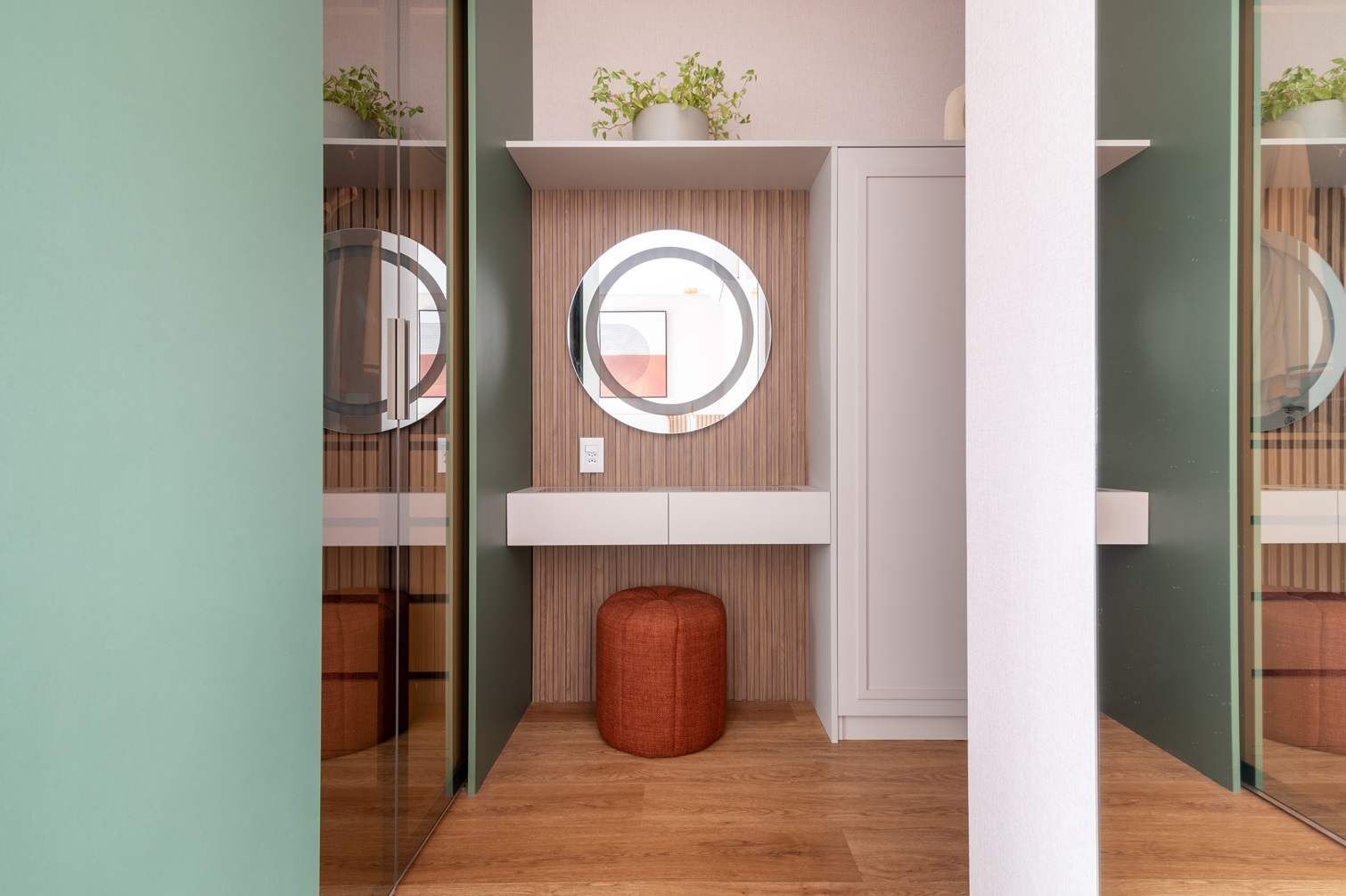 A geometria se tornou o fio condutor do projeto, presente em diversos elementos de decoração, como móveis, tapetes e revestimentos. Essa escolha trouxe uma unidade visual que permeia todo o apartamento, reforçando o conceito de design como um todo. As formas geométricas também aparecem nas obras de arte e nos espelhos distribuídos pelos ambientes, criando uma atmosfera contemporânea e equilibrada.