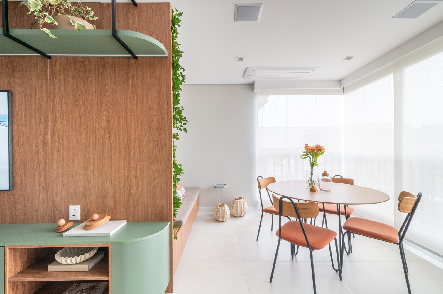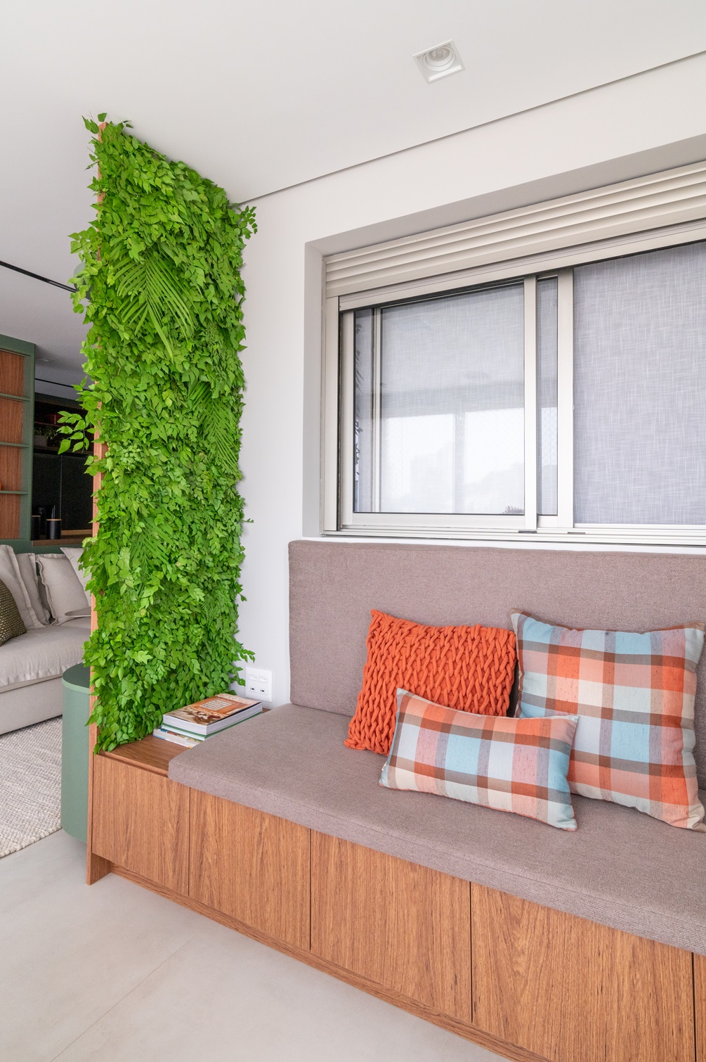 Na varanda, a marcenaria sob medida criou um banco contínuo que se conecta ao painel de TV, promovendo uma integração perfeita entre os espaços. Esse detalhe não só amplia a sensação de amplitude, como também garante uma transição suave entre os ambientes internos e externos, criando um refúgio multifuncional, ideal para momentos de relaxamento ou lazer em família.