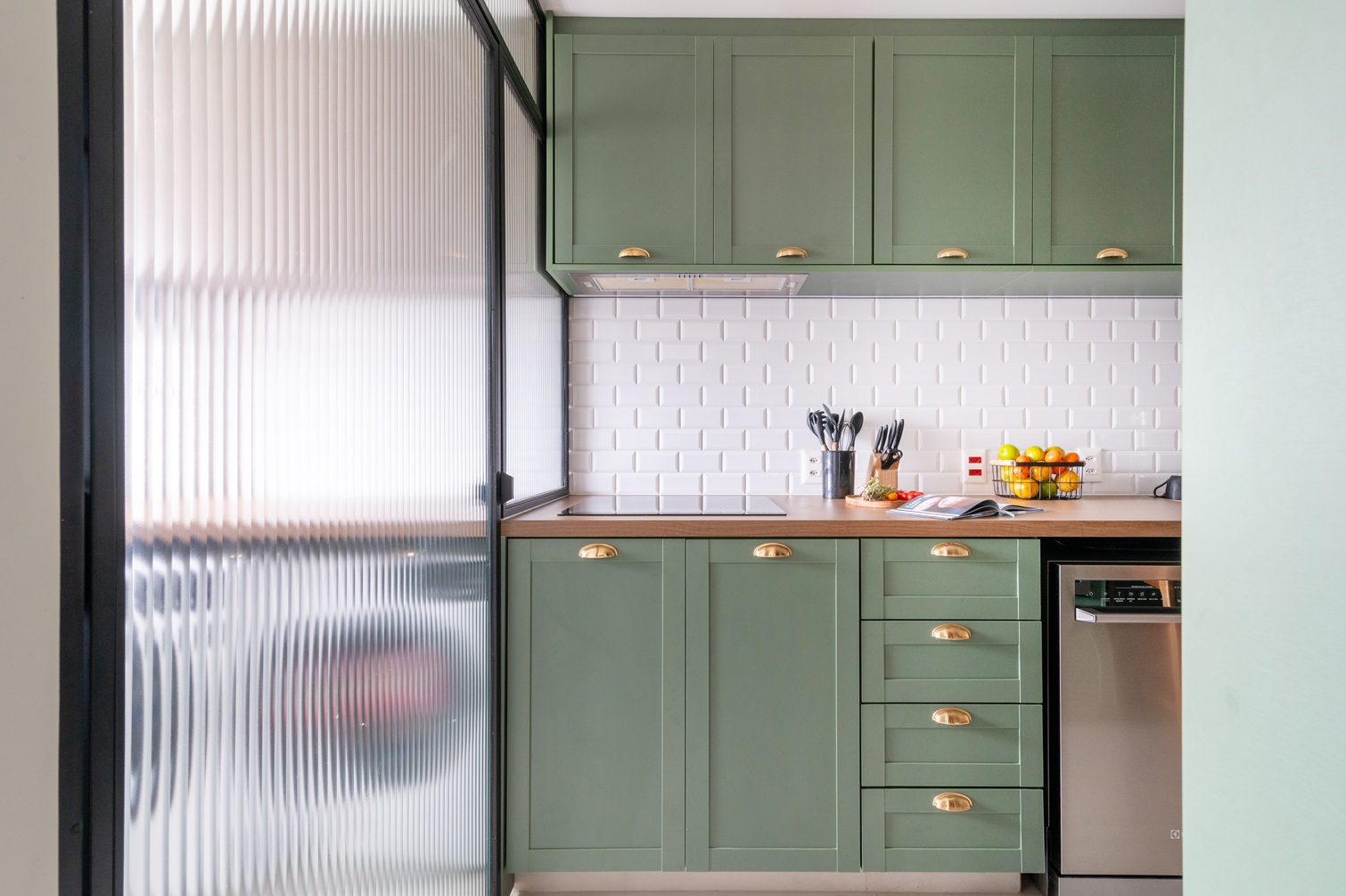 A cozinha foi projetada com foco na praticidade sem abrir mão do charme. Cada centímetro foi aproveitado para garantir que o ambiente fosse funcional para o dia a dia. A divisória com vidro canelado, que separa a cozinha da lavanderia, não só trouxe leveza, como também contribuiu para manter as duas áreas visualmente agradáveis e organizadas.