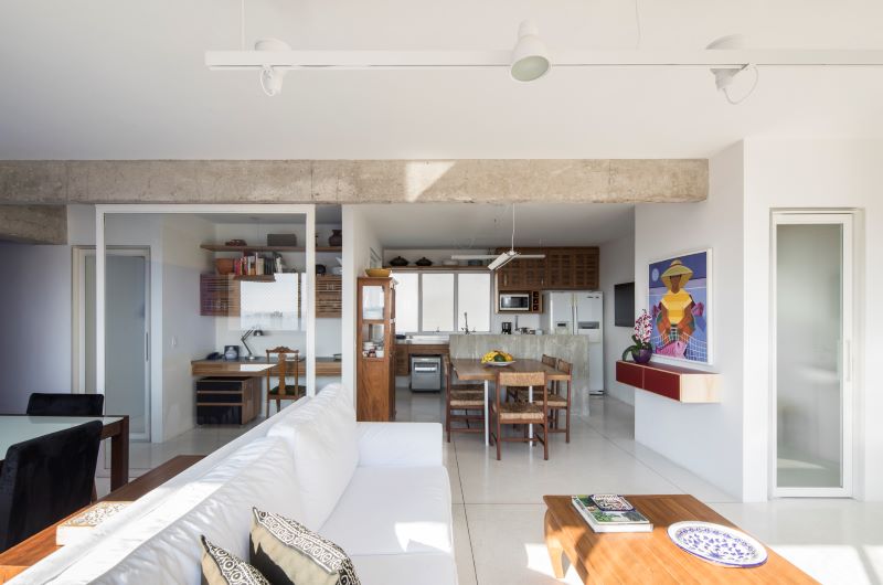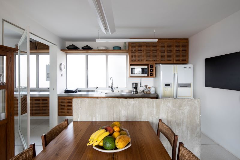 Nesse projeto, o escritório Meridional Arquitetura, comandado por Luiz Sobral, realizou uma nova reforma no imóvel dos anos 1970 que valorizou os aspectos originais, introduzindo novos elementos para o melhor aproveitamento da moradora.