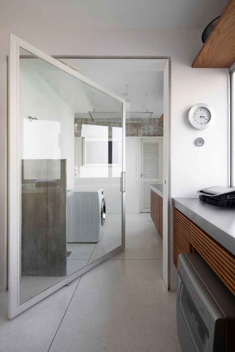 Um perfil interno permitiu que portas de ferro fossem instaladas sem a necessidade de um acabamento. Isso aliado à tonalidade branca escolhida trouxe leveza para a ambientação.