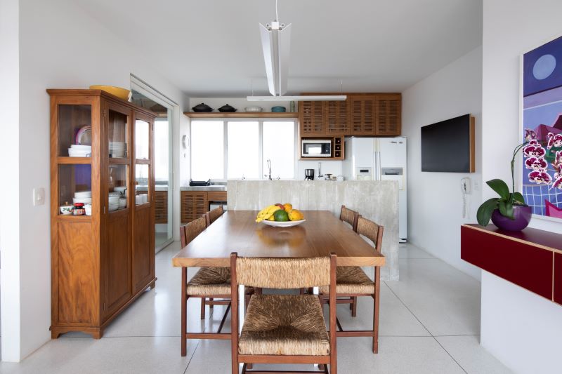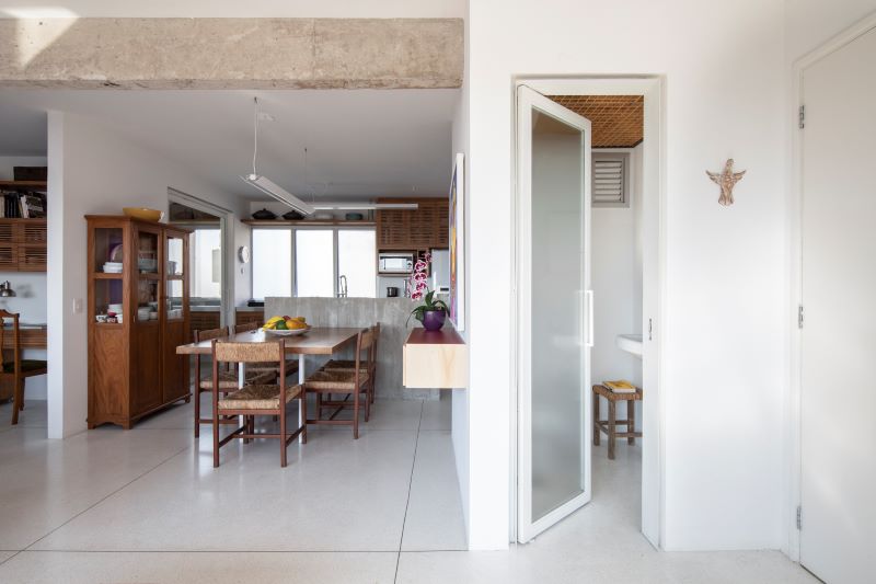 Os móveis da antiga casa da moradora foram reaproveitados e o piso de granilite foi escolhido para atender as necessidades de orçamento da cliente.