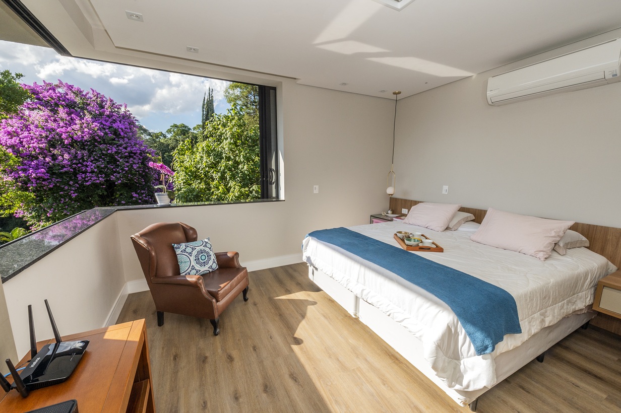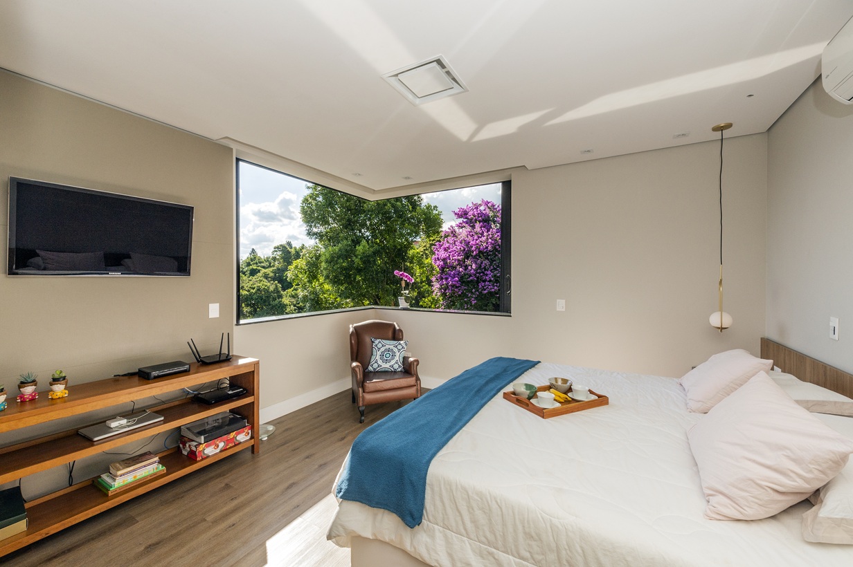 A suíte principal se destaca pelo closet espaçoso e uma janela panorâmica que emoldura a natureza como uma obra de arte, proporcionando uma conexão visual constante com o verde.