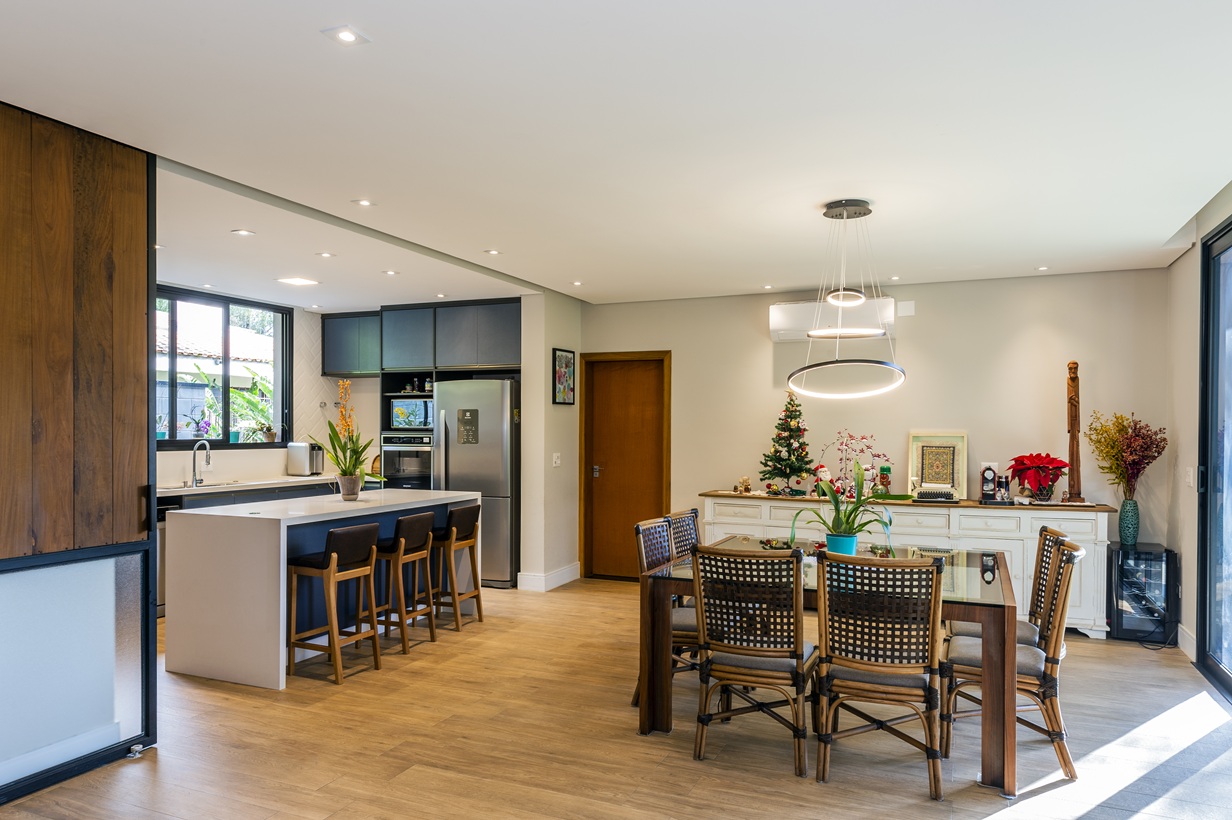 Localizada na Granja Viana, em São Paulo, esta residência de 310 m² é uma ode à união entre o sofisticado e o rústico. Idealizada para uma família moderna com crianças, a obra de Daniel Szego equilibra a funcionalidade do dia a dia com uma estética atemporal e convidativa. A integração fluida entre os ambientes internos e o exuberante jardim cria uma sensação de bem-estar constante, onde a natureza se torna uma extensão do lar.